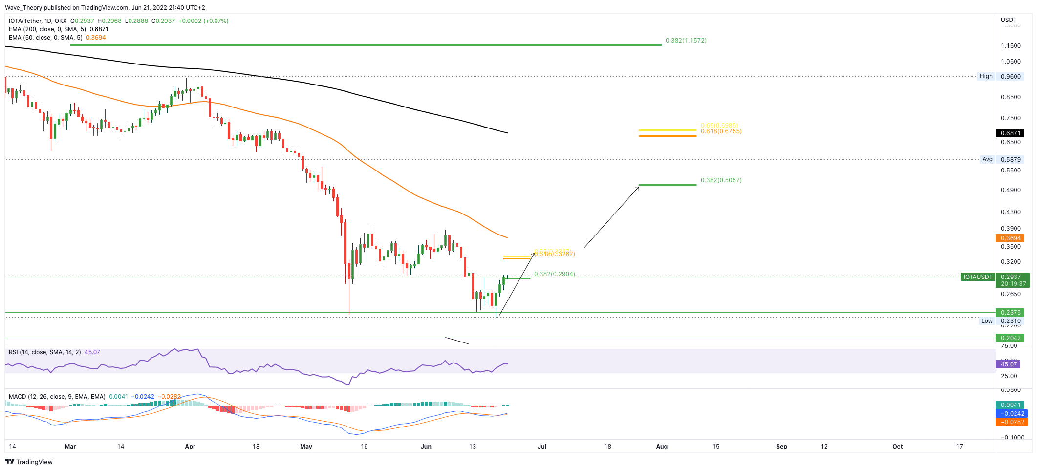 Im Tageschart zeichnet sich eine massive bullische Divergenz im RSI und Histogramm des MACDs ab, woraufhin der IOTA Kurs auch schon rund 29 % steigen konnte. Nun stößt der IOTA Kurs am 0,382 Fib Niveau bei rund 0,29 USD auf Widerstand. Bricht IOTA diesen Widerstand, könnte IOTA zur Golden Ratio bei rund 0,33 USD steigen.