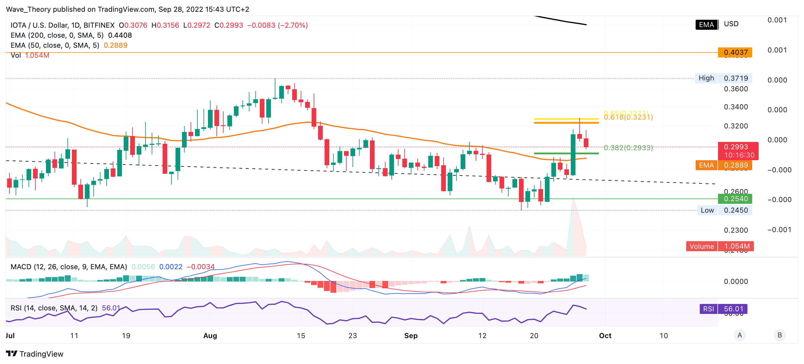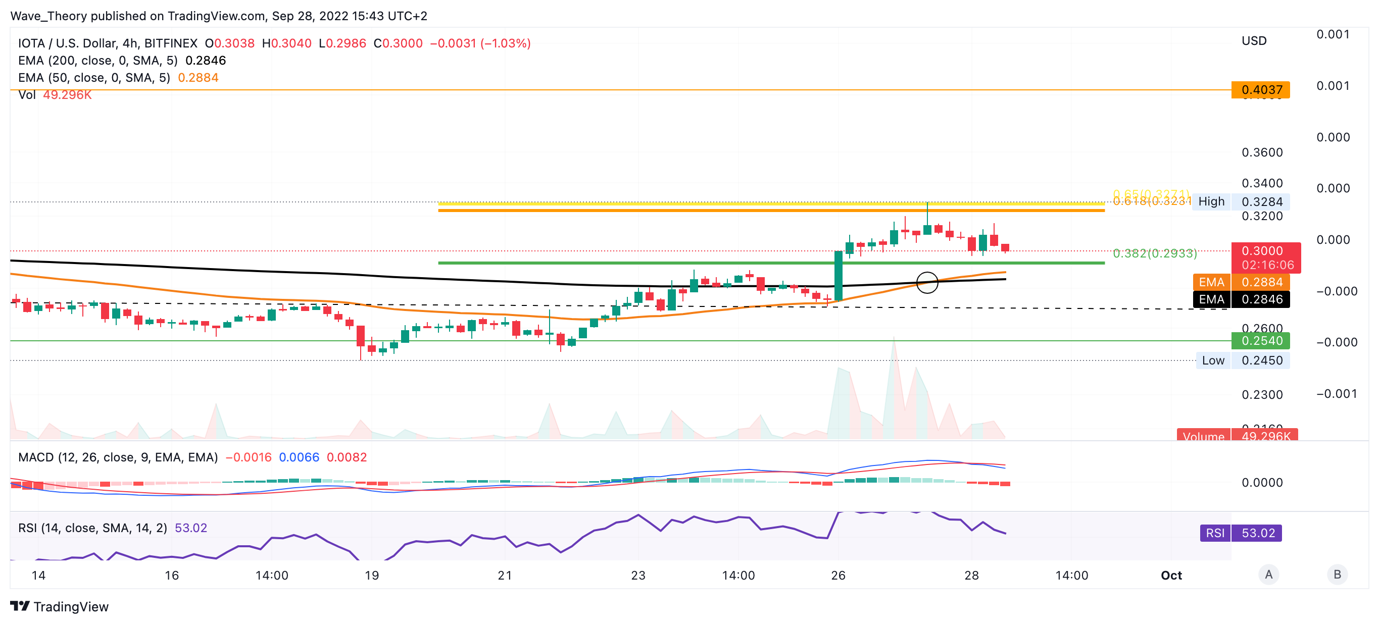 Der IOTA Kurs kehrte zur Unterstützung zwischen 0,2 USD und 0,254 USD zurück und konnte daraufhin einige Tage steigen. Anschließend erreichte der IOTA Kurs den Golden Ratio Widerstand bei rund 0,33 USD, woran IOTA stark bärisch abgewiesen wurde. Dabei stößt IOTA jetzt am 50-Tage-EMA bei rund 0,289 USD und an der Golden Ratio bei rund 0,275 USD auf signifikante Unterstützung.