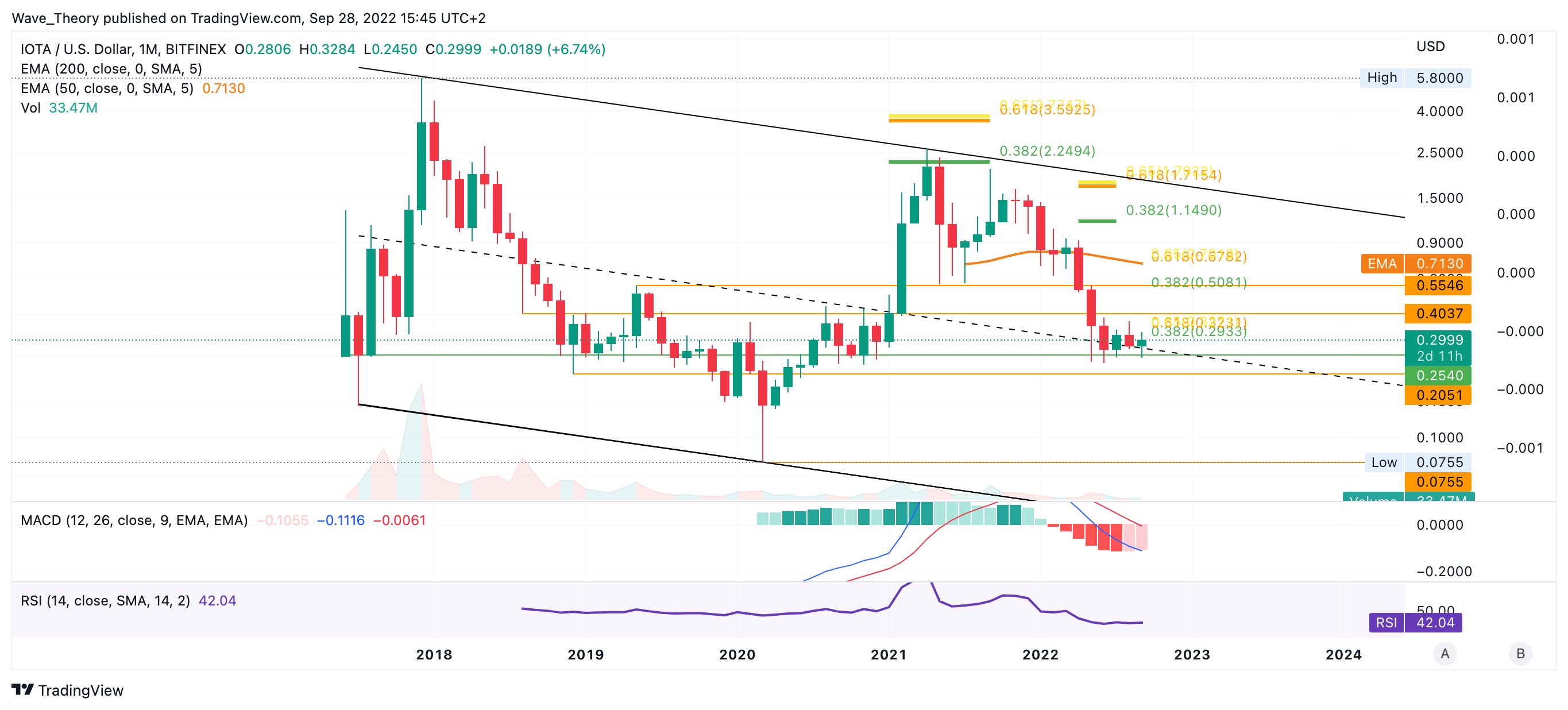 Langfristig befindet sich der IOTA Kurs noch immer in einem parallelen Abwärtskanal. Doch das Histogramm des MACDs tickt seit letztem Monat bullisch höher. Zudem befindet sich der IOTA Kurs seit vier Monaten in einem ähnlichen Preisterritorium.