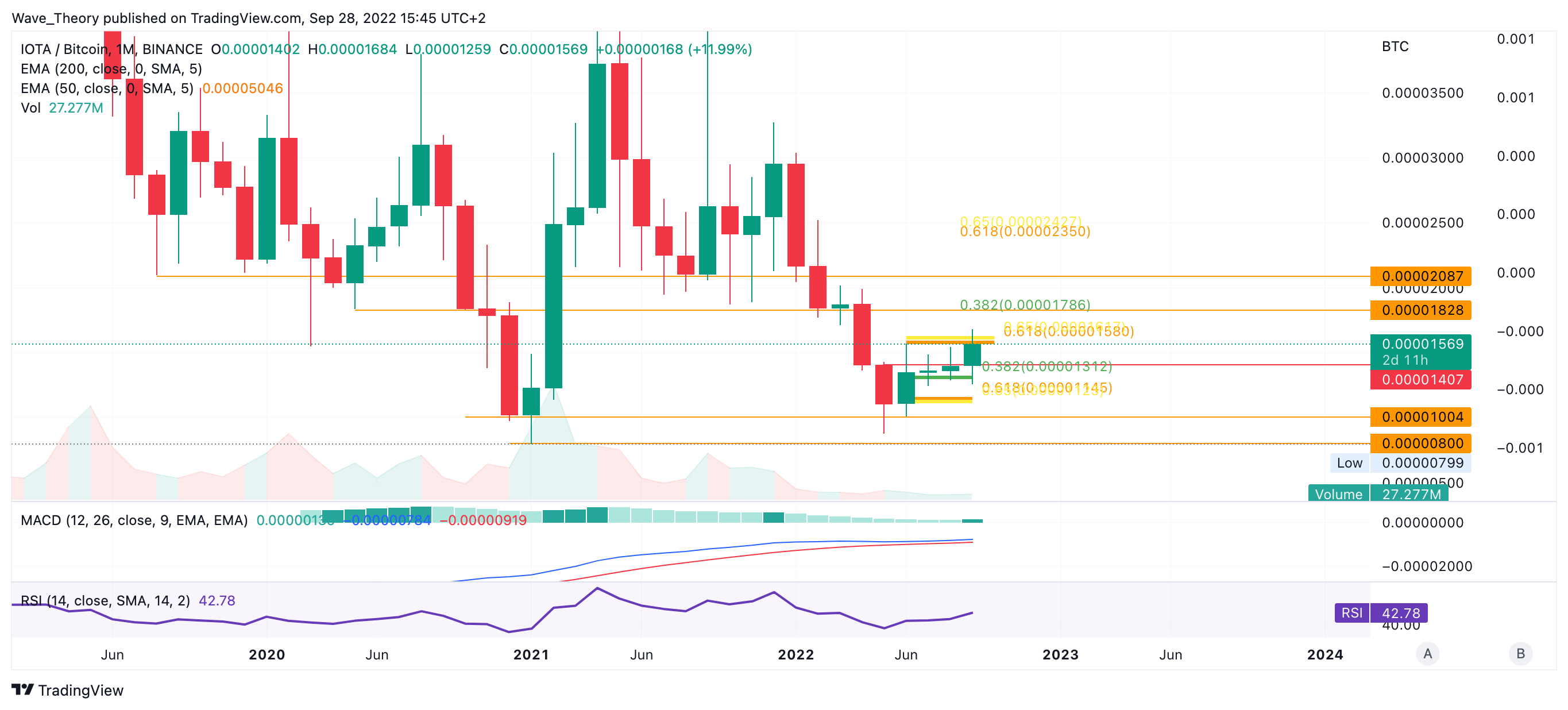 IOTA stößt jetzt an der Golden Ratio bei rund 0,0000158 BTC auf signifikanten Widerstand. Bei einem bullischen Bruch wartet bei rund 0,00001786 BTC und 0,000024 BTC der nächste signifikante Widerstand.