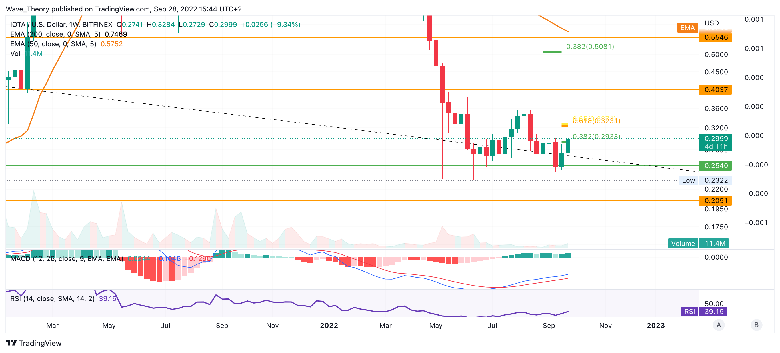 Um die Korrektur zu beenden, muss IOTA jedoch die Golden Ratio bei rund 0,33 USD brechen. Dann könnte IOTA zum 0,382 Fib Niveau bei rund 0,5 USD oder gar zum 50-Wochen-EMA bei rund 0,55 USD steigen.