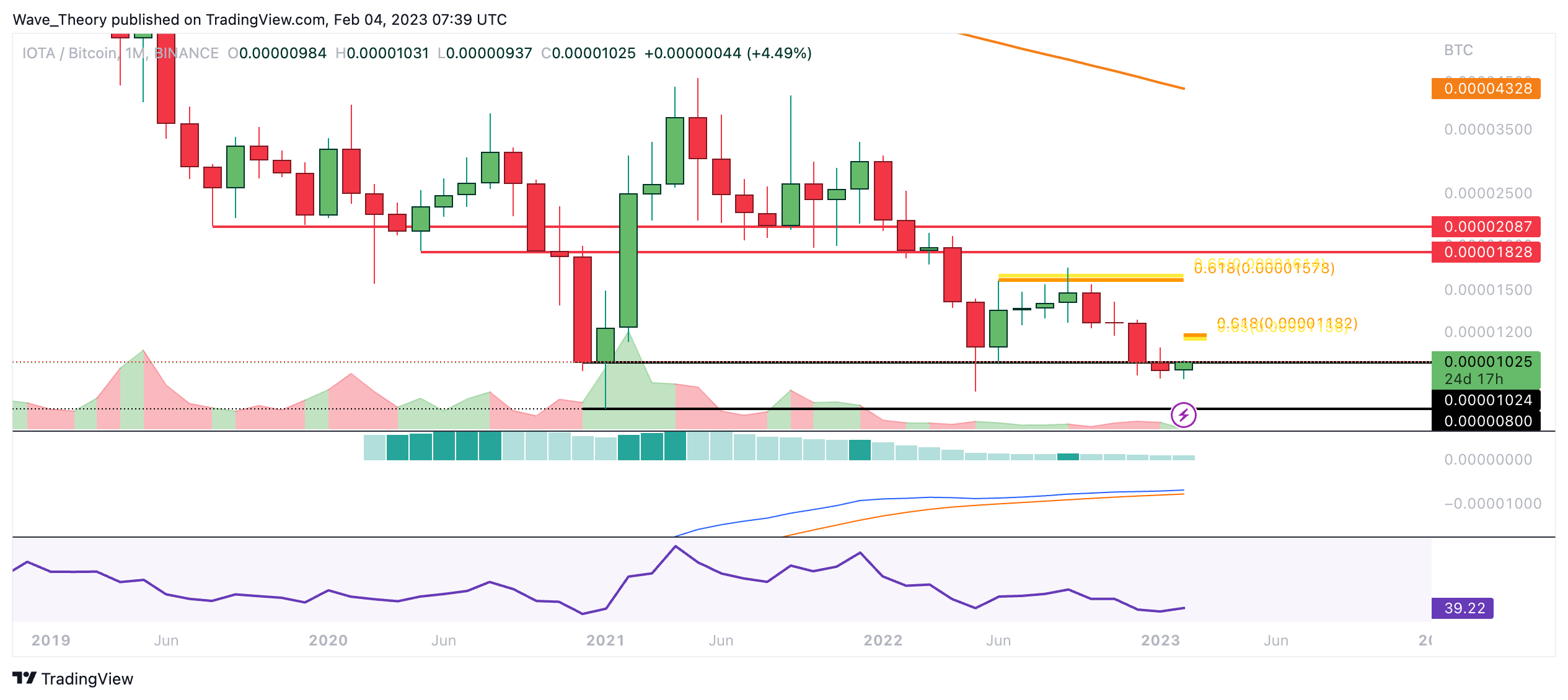 Gegen BTC erreichte IOTA horizontale Unterstützung zwischen rund 0,000008 BTC und rund 0,00001024 BTC und prallte daran ab. Damit wartet jetzt bei rund 0,00001192 BTC der nächste signifikante Fib Widerstand. Jedoch tickt das Histogramm des MACDs seit einigen Monaten bärisch tiefer und auch die MACD Linien stehen kurz vor einer bärischen Überkreuzung.