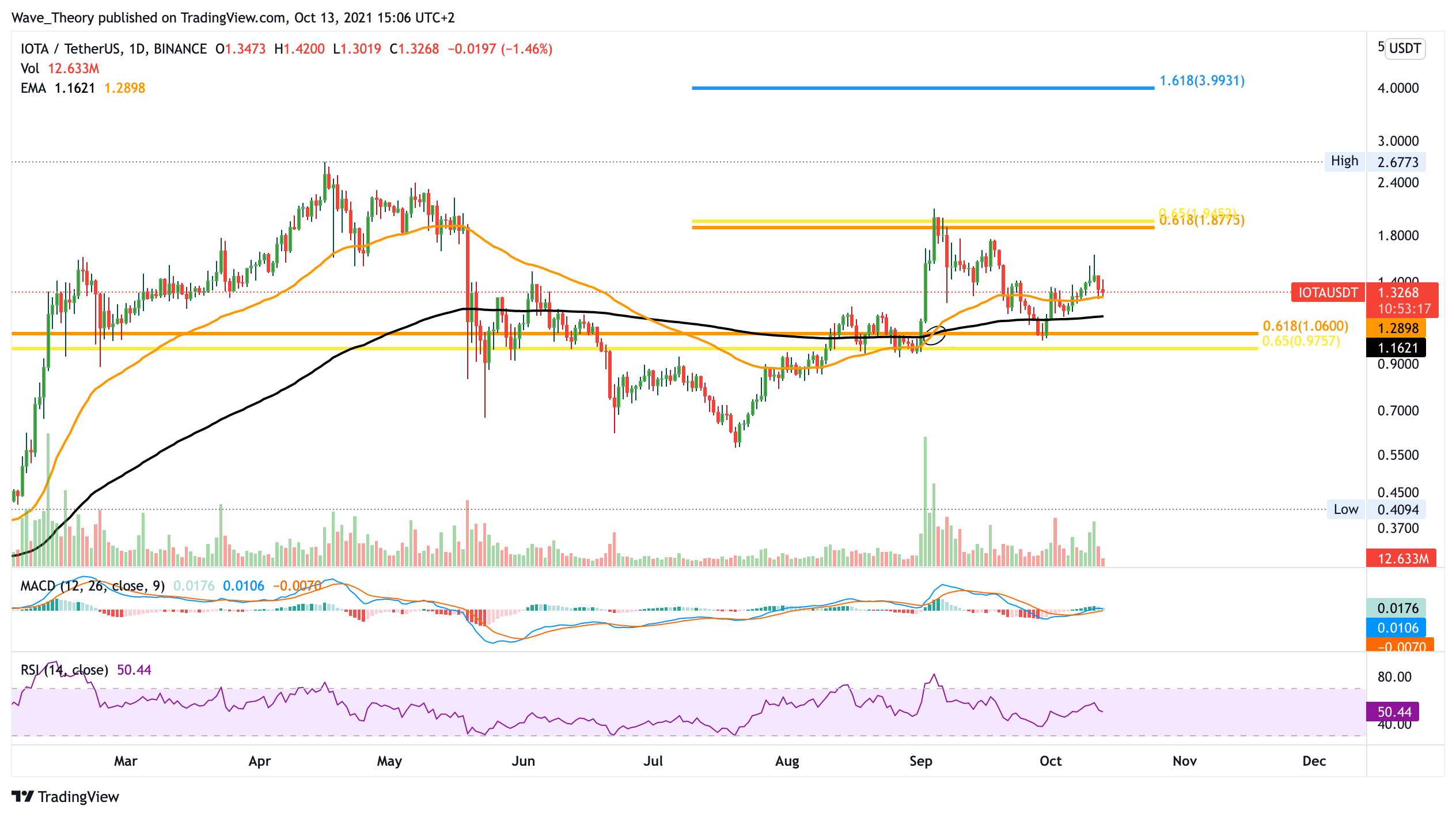 Der Tageskurs zeigt sich hinsichtlich des Golden Crossovers bullisch. Dennoch pendelt der IOTA Kurs zwischen der Golden Ratio Unterstützung bei 1,0 USD und dem Golden Ratio Widerstand bei 1,9 USD. Ob der IOTA Kurs mittelfristig bullisch verlaufen wird, wird entschieden wenn IOTA durch eins der beiden Fibonacci Niveaus durchbricht.