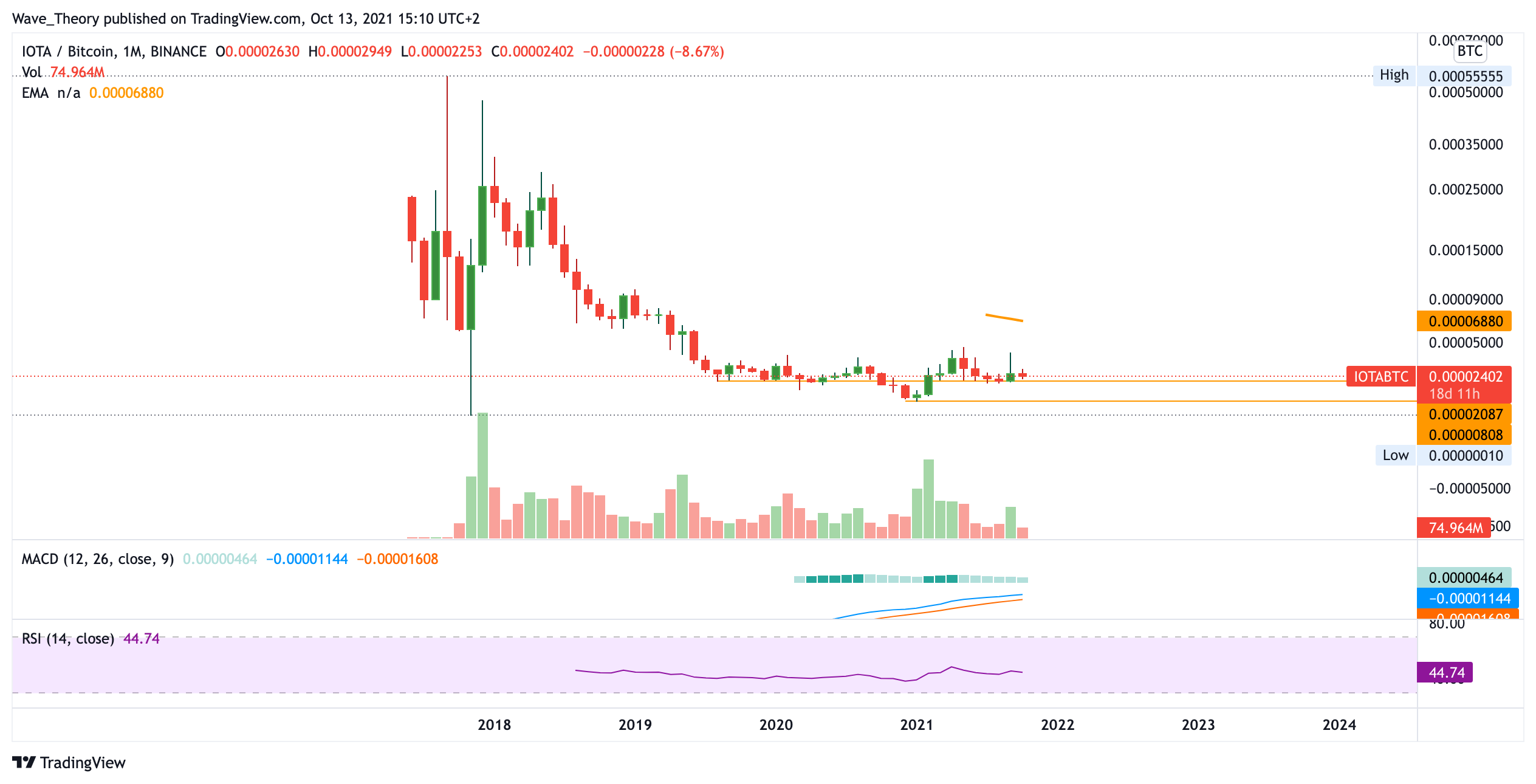 Gegen Bitcoin befindet sich IOTA seit Jahren in einem starken Abwärtstrend. Zwischen 0,000008 und 0,000020 BTC findet IOTA Unterstützung. Ob IOTA jemals alte Höchststände erreichen wird, steht in den Sternen. Grundsätzlich geht Bitcoin im Vergleich als der klare Gewinner hervor.