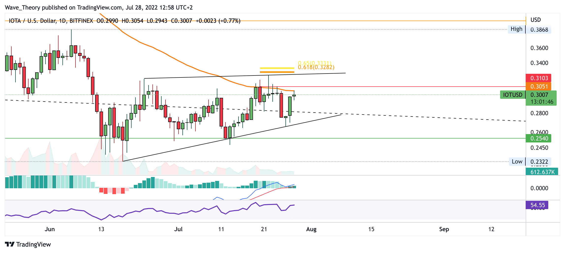IOTA Kurs kämpft mit 50-Tage-EMA Widerstand bei rund 0,305 USD