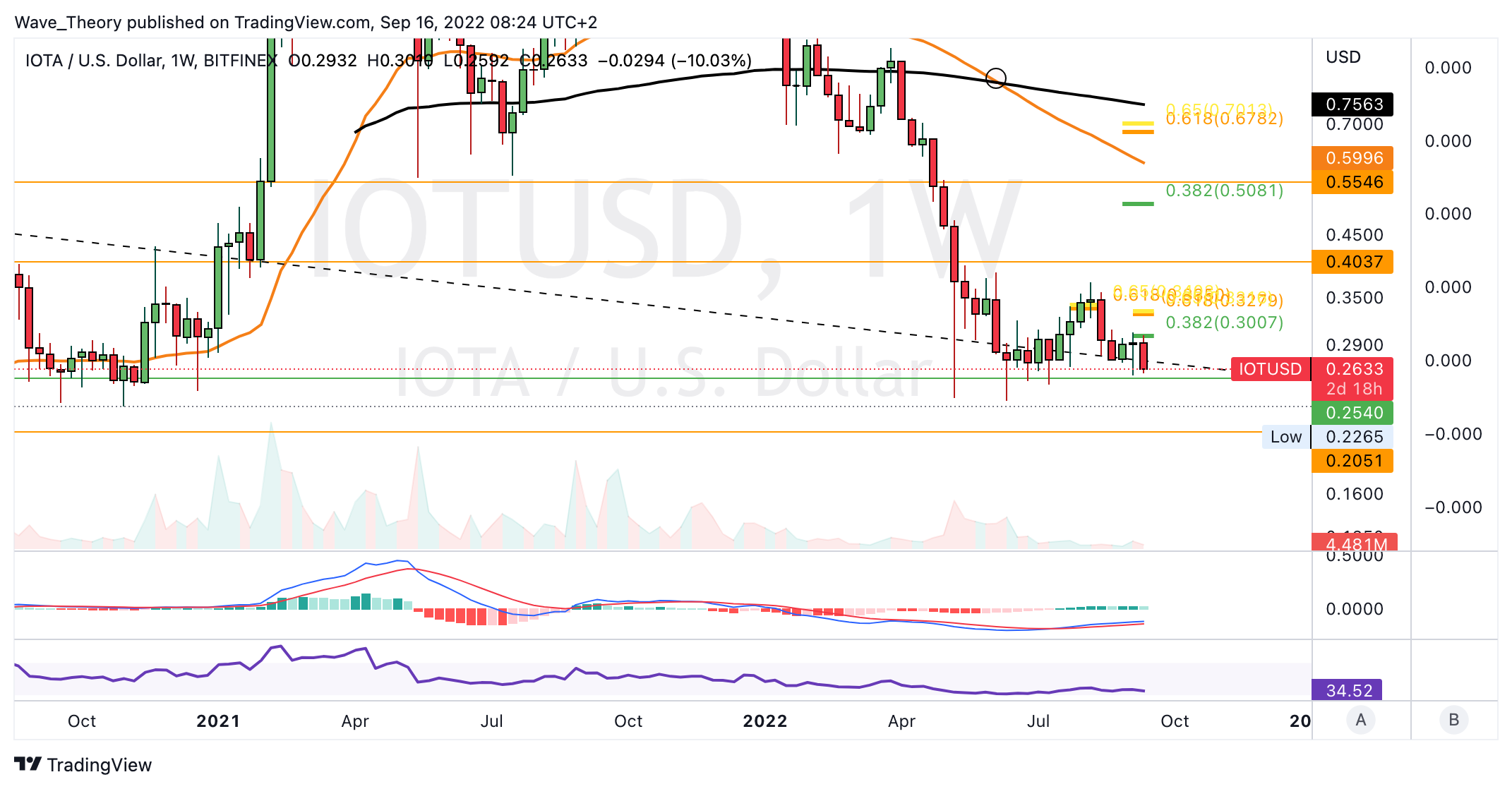 Auch im Wochenchart etablierte sich ein Death Cross, womit der Trend auch mittelfristig bärisch bestätigt ist. Zwischen 0,2 USD und 0,254 USD findet IOTA signifikante Unterstützung.