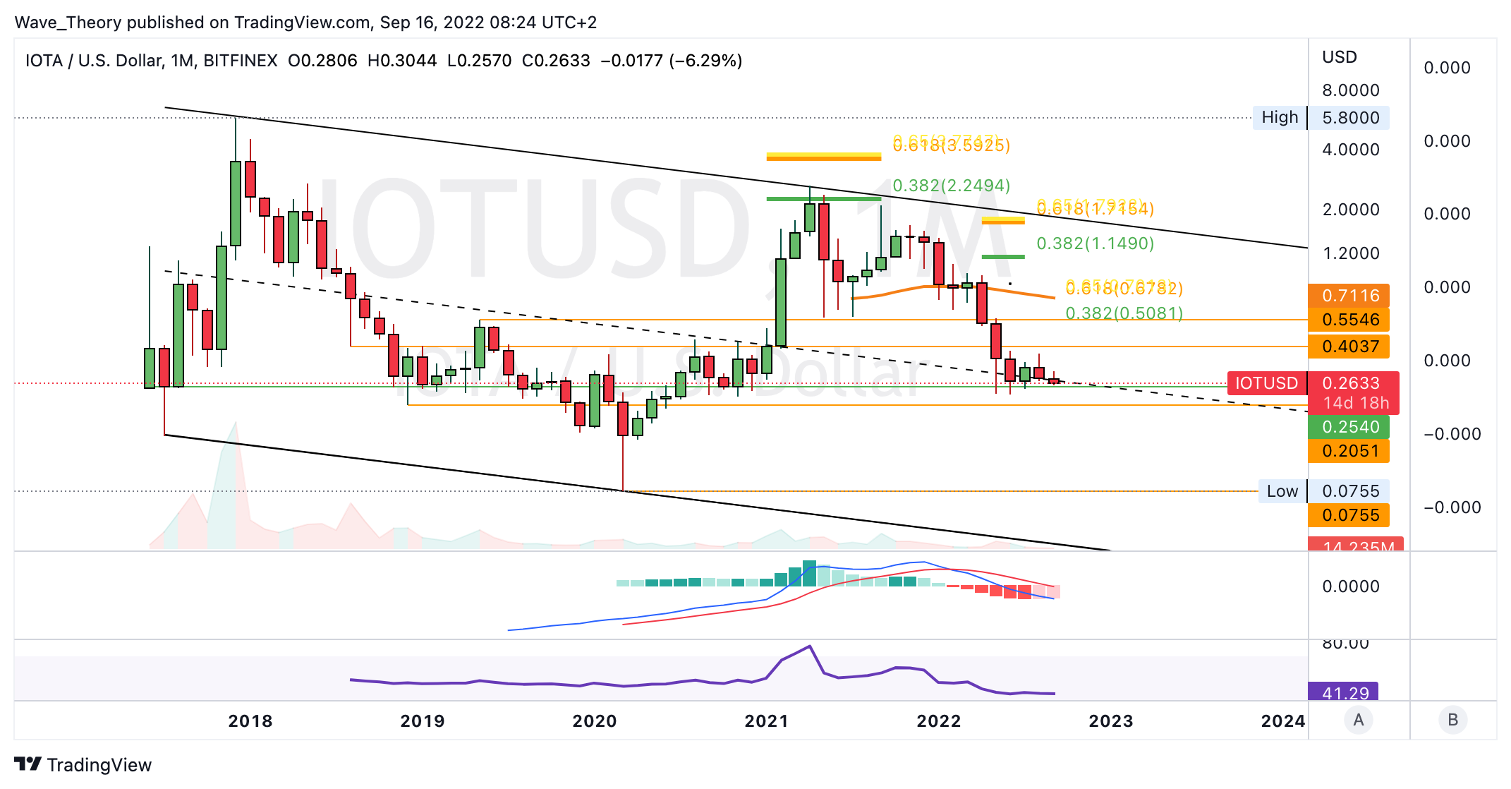 Im Monatschart befindet sich der IOTA Kurs nach wie vor in einem parallelen Abwärtskanal. Jedoch befindet sich IOTA noch immer an der Mittellinie des Kanals, welche als signifikante Unterstützung dient.