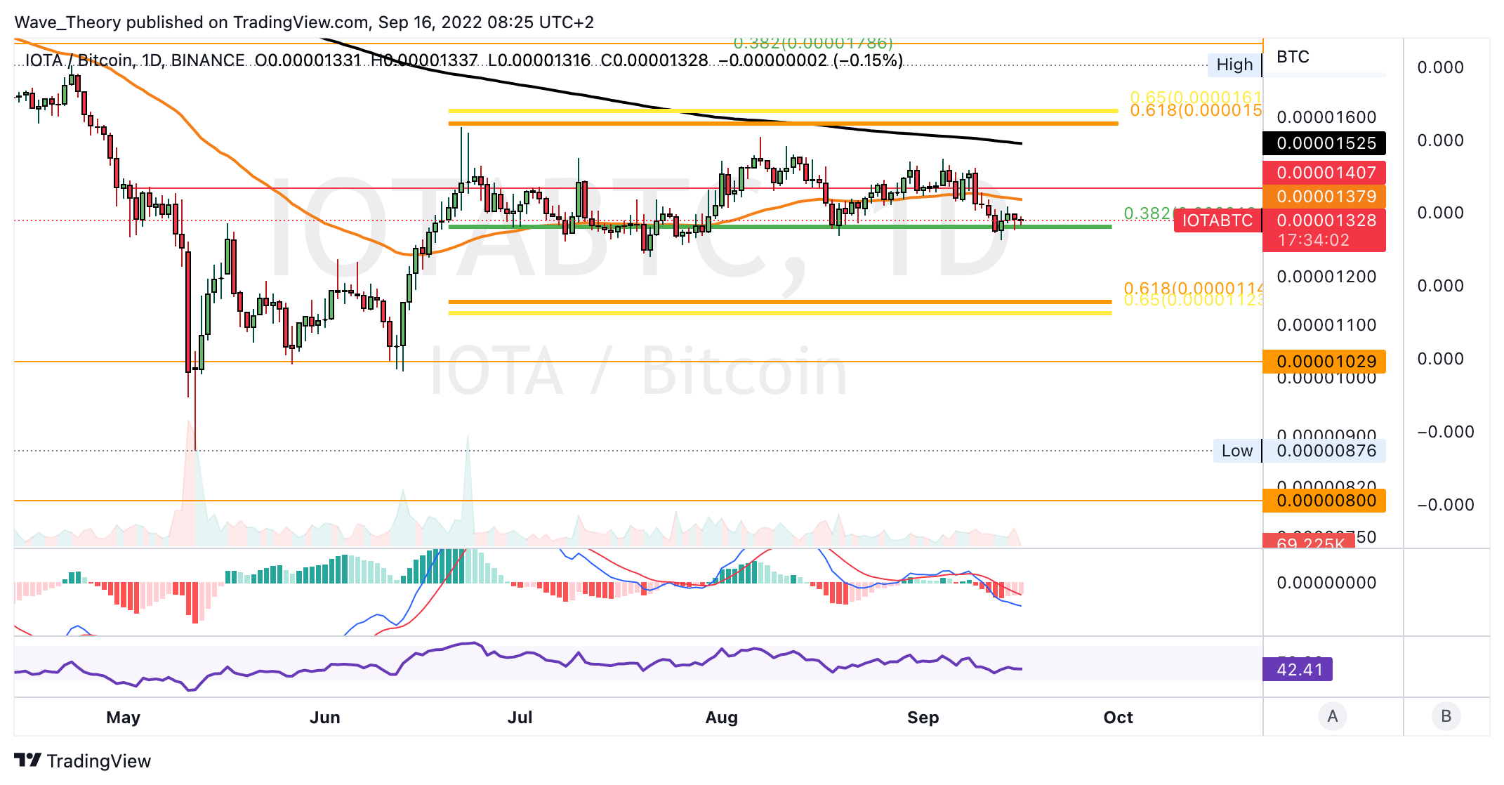 Gegen BTC bewegt sich IOTA nach wie vor zwischen zwei Fib Niveaus