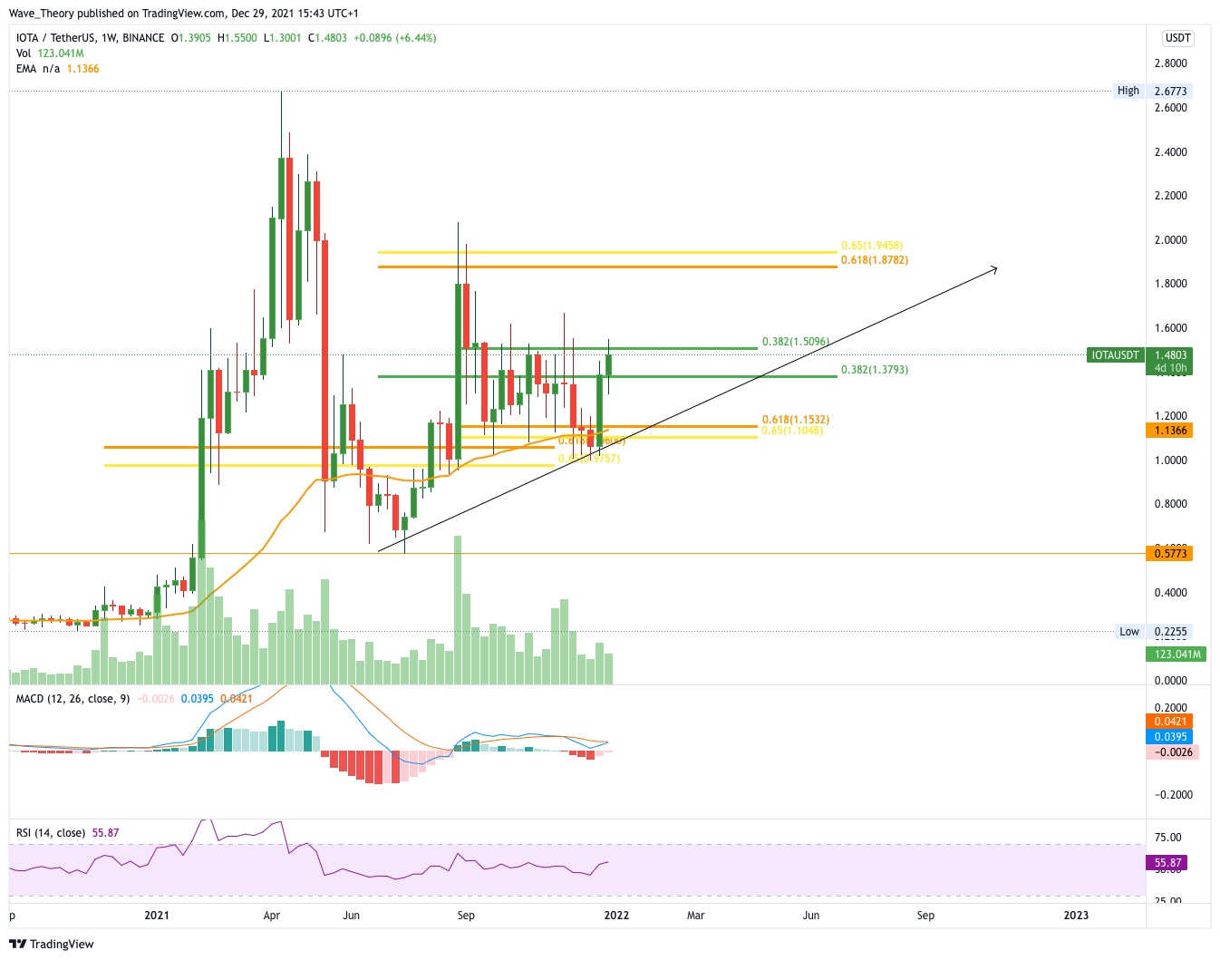 Der IOTA Kurs erreichte einen Höhepunkt bei rund 2,7 USD zu Beginn des Jahres. In den folgenden Monaten fiel IOTA auf rund 0,6 USD zurück um anschließend bis rund 2 USD zu steigen, wo IOTA am Golden Ratio Widerstand auf Ablehnung stieß. Anschließend korrigierte IOTA zur Golden Ratio bei rund 1 USD und durchbrach daraufhin den 0,382 Fib Widerstand bei rund 1,5 USD.