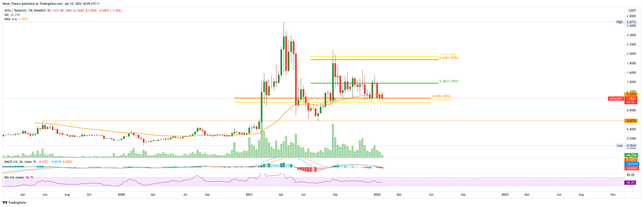 Der IOTA Kurs wurde bärisch am Fibonacci Niveau bei rund 1,4 USD abgewiesen, womit der IOTA Preis zur Golden Ratio bei rund 1 USD zurückkehrt.