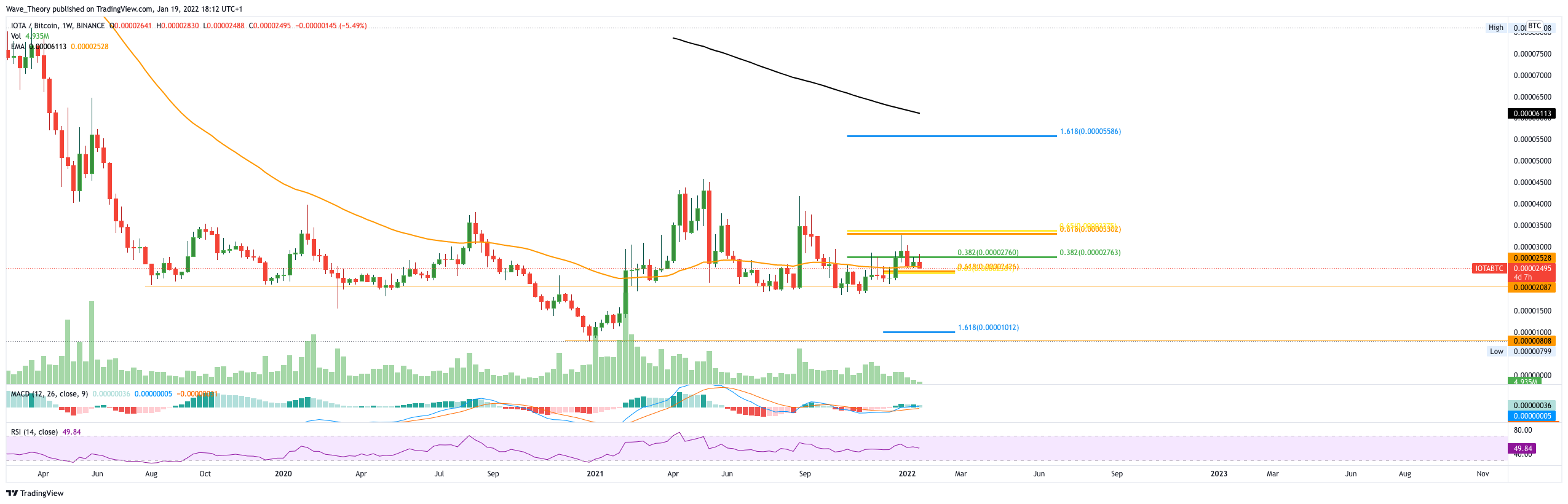 Gegen BTC befindet sich der IOTA Kurs ebenfalls an der Golden Ratio Unterstützung bei rund 0,000024 BTC. IOTA könnte daran stark abprallen, um erneut zum 0,382 Fib Widerstand bei 0,0000276 BTC zu steigen. Andernfalls findet IOTA spätestens bei 0,0000209 BTC und bei 0,000008 BTC massive Unterstützung. Aktuell sieht es mittelfristig danach aus, dass IOTA seine Abwärtsbewegung fortsetzt, selbst wenn IOTA nun an der Golden Ratio Unterstützung abprallt. Schließlich wurde IOTA am Golden Ratio Widerstand und anschließend am 0,382 Fib Niveau abgewiesen. Dies bestätigt den Abwärtstrend.