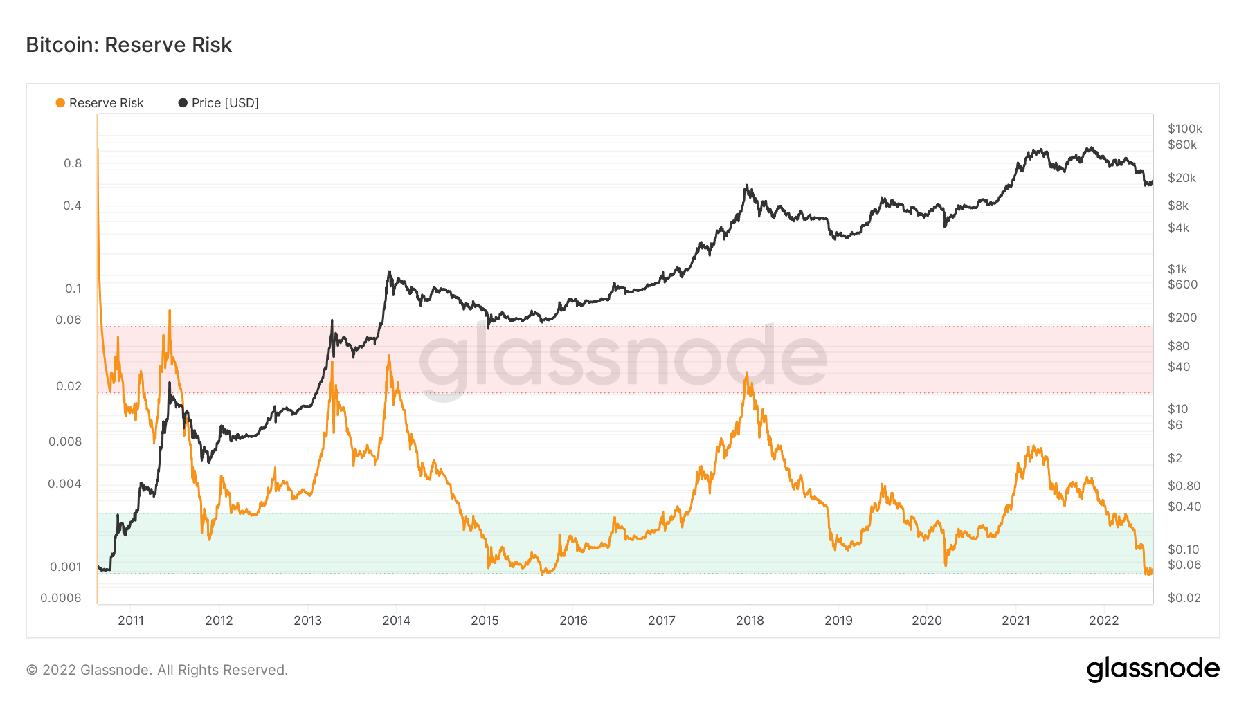 Der Reserverisiko-Indikator misst das Vertrauen der HODLer im Verhältnis zum derzeitigen Preis. Ins Gewicht fallen vor allem die Anzahl der gehaltenen Tage eines Assets bis zu dem Zeitpunkt an dem er diese verkauft.