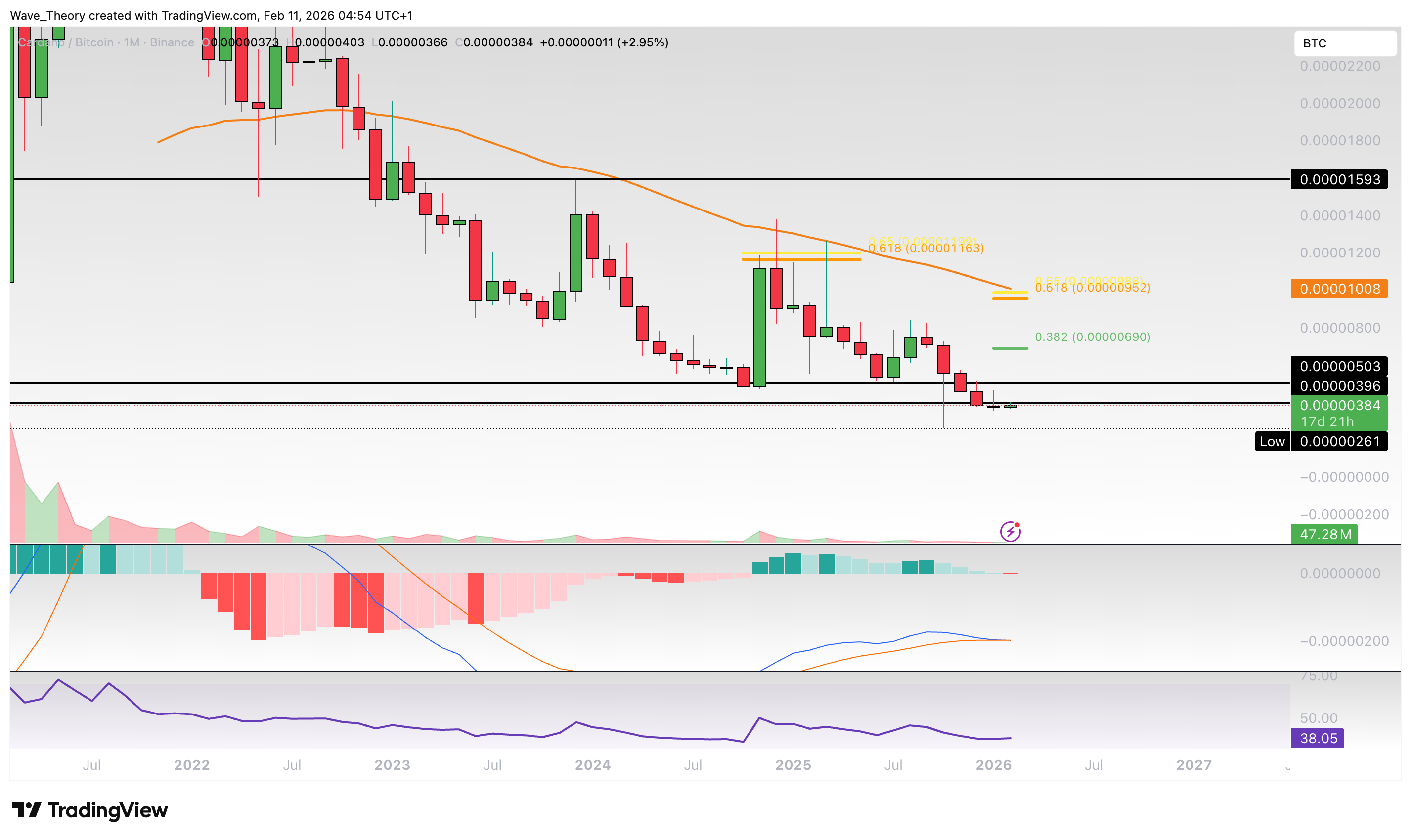 Bei rund 0,00001008 BTC wartet zusätzlicher Widerstand am 50-Monate-EMA. Davon abgesehen zeigt sich der RSI neutral, wohingegen sich die MACD Linien jetzt bärisch überkreuzt könnten.
