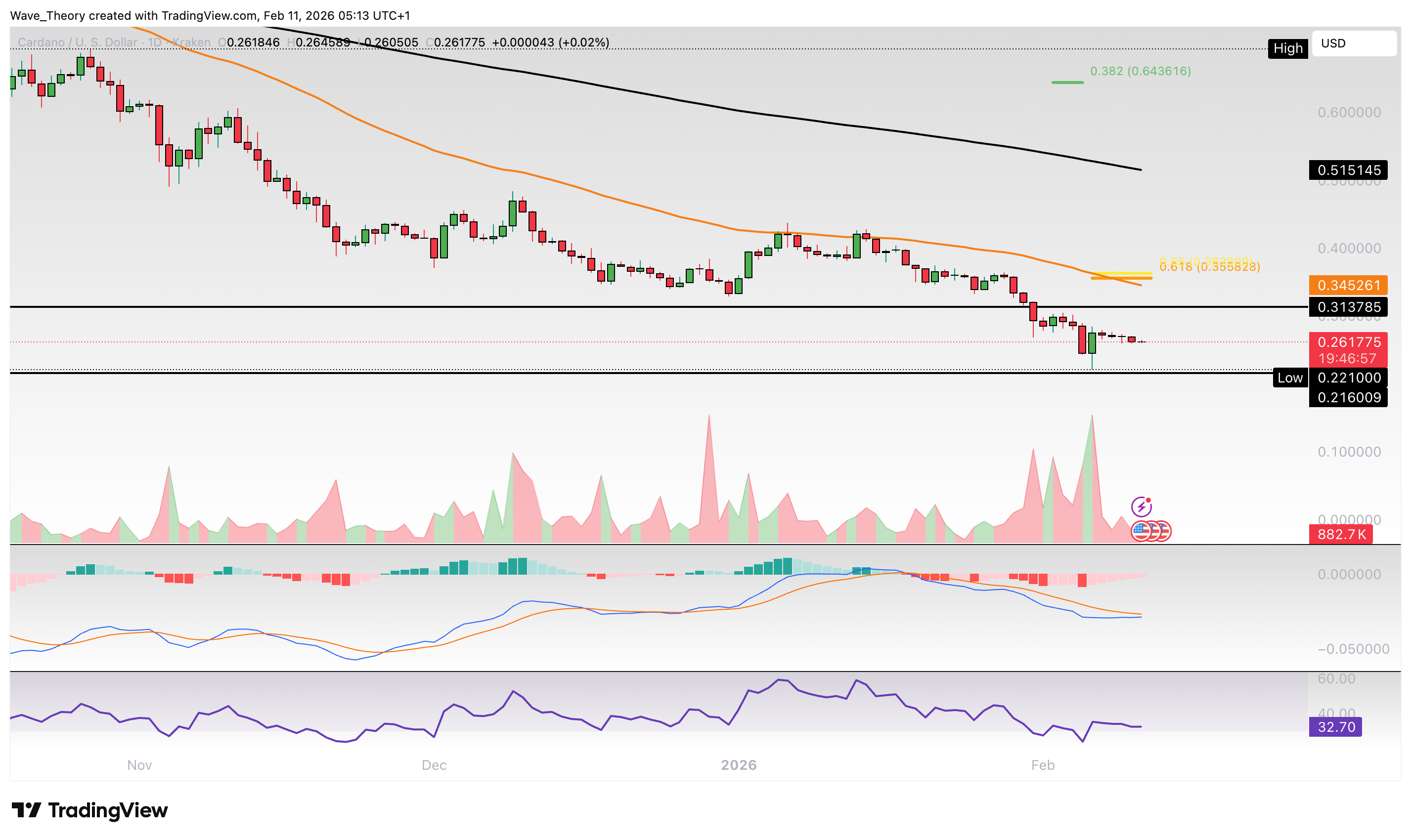 Der ADA Kurs stößt jetzt auf historische Unterstützungszone zwischen rund 0,216 USD und 0,313 USD. Dort könnte der Kurs jetzt bullisch abprallen, um eine Aufwärtsbewegung zum Golden Ratio Niveau bei rund 0,36 USD zu initiieren.