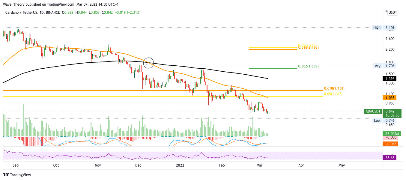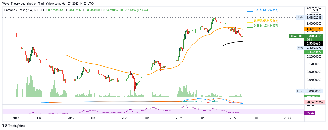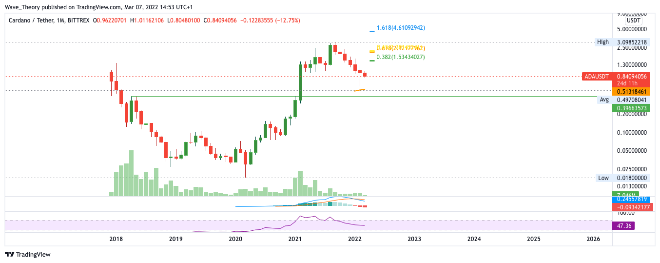 Zwischen 0,4 – 0,6 USD wartet also massive Unterstützung auf den ADA Kurs und sollte sich Cardano über dieser Unterstützung halten, findet er bereits bei rund 1,5 USD und 2,2 USD signifikante Fibonacci Widerstände. Erst wenn Cardano den Widerstand der Golden Ratio bei 2,2 USD bullisch durchbricht, kann Cardano einen bullischen Trendwechsel vollziehen. Bricht Cardano also die Golden Ratio bei 2,2 USD, ist die Korrektur vorbei und Cardano kann sein ATH bei rund 3 USD anvisieren.
