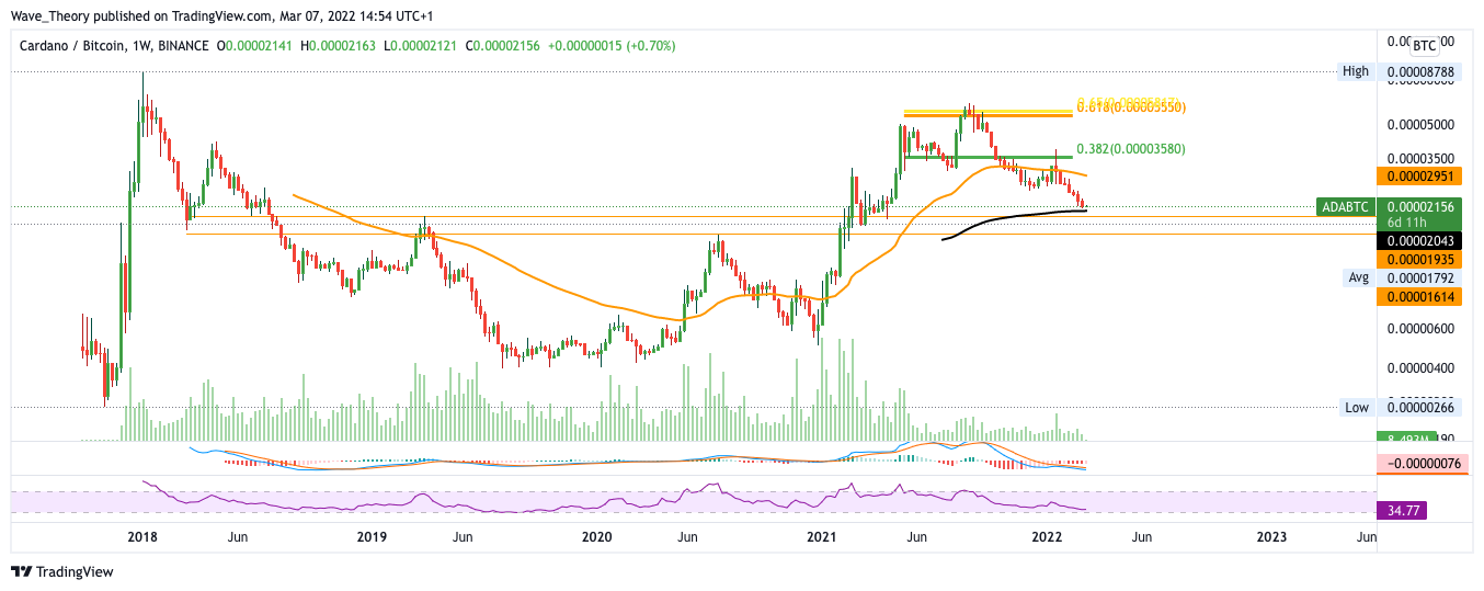 Gegen BTC stößt der ADA Kurs jetzt auf massive Unterstützung, denn zwischen 0,000016 – 0,00002 BTC wartet nicht nur historische Unterstützung auf den ADA Kurs, sondern auch der 200-Wochen-EMA. Zudem erreicht der RSI bald überverkaufte Regionen und das Histogramm scheint diese Woche zum ersten Mal seit einigen Wochen bullisch höher zu ticken. Dies kann sich aber natürlich im Laufe der Woche noch ändern, da die Woche erst begonnen hat.