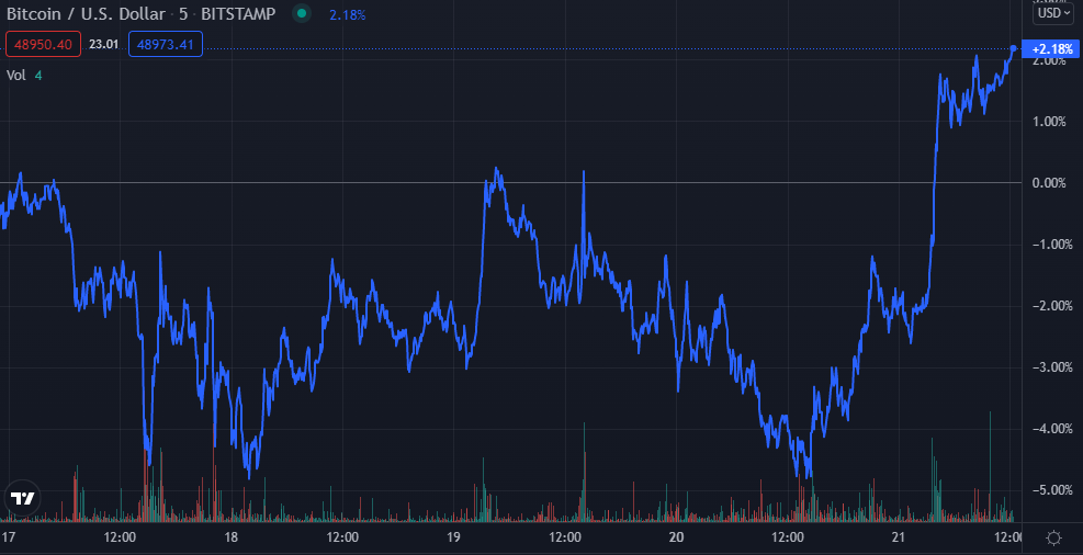 Nachdem der Bitcoin Kurs am 10. November 2021 ein neues Allzeithoch bei über 68.000 US-Dollar ausgebildet hatte, ging es für den BTC Kurs erstmal nach unten. Seit einigen Tagen rangiert der Bitcoin Kurs in einer Seitwärtsbewegung zwischen 50.000 und 45.000 US-Dollar. Nach dem Tweet von Jack Dorsey bezüglich Bitcoins Überlegenheit gegenüber dem US-Dollar, schaffte der Bitcoin Kurs einen 6-prozentigen Sprung auf fast 49.000 US-Dollar.