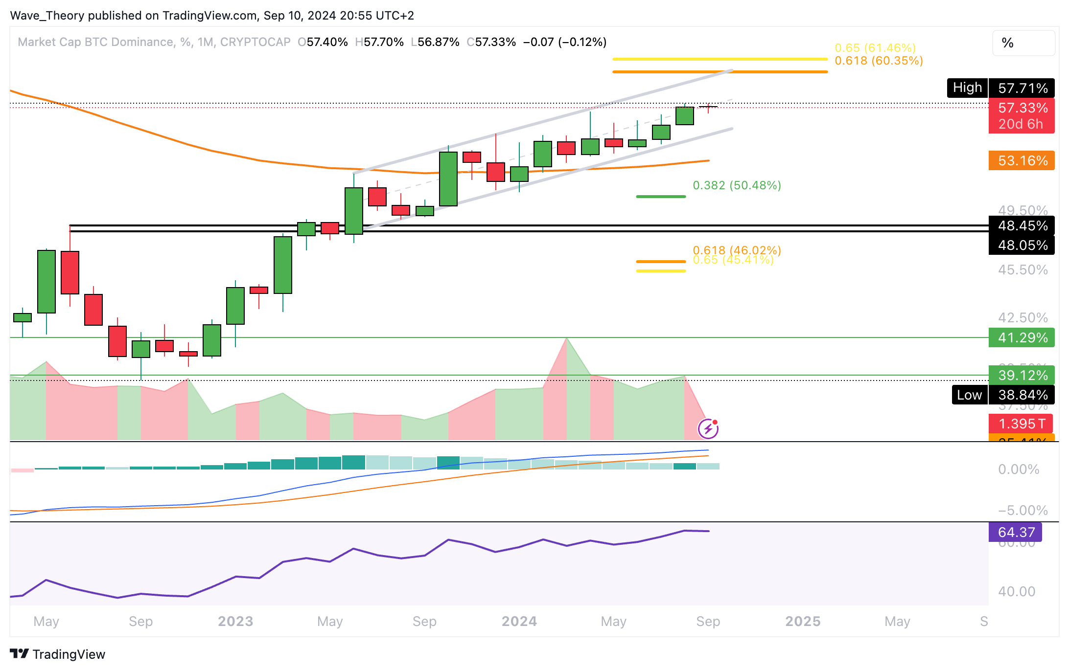Nach unten hin warten bei rund 50,5 % und 46 % die nächsten signifikanten Fibonacci Unterstützungen. Jedoch wartet bereits am 50-Monate-EMA bei rund 53,2 % signifikante Unterstützung auf die BTC Dominanz.