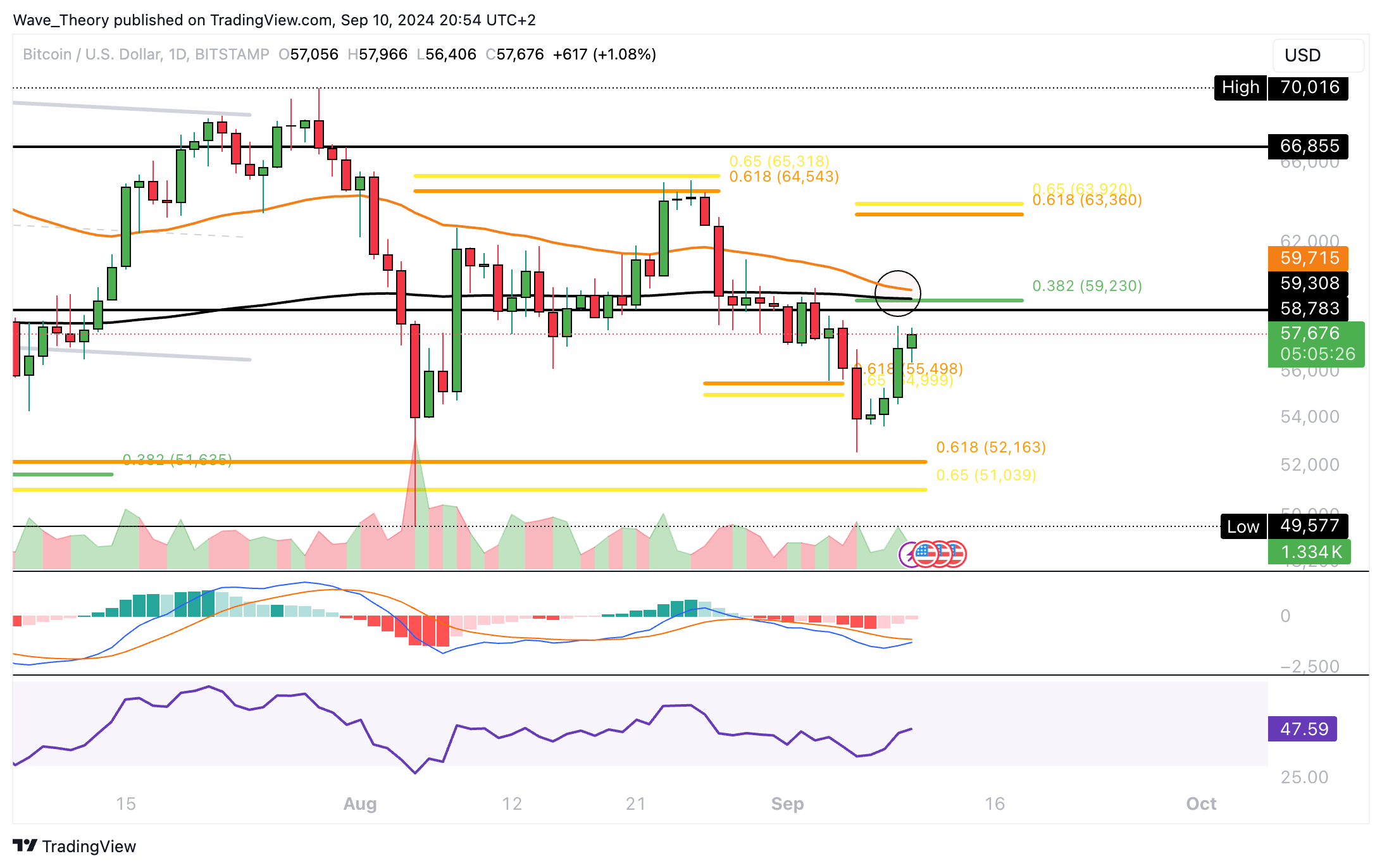 Tatsächlich konnte Bitcoin vor wenigen Tagen erneut die Golden Ratio Unterstützung bei rund 52.150 USD erreichen, um daran bullisch abzuprallen. Damit warten jetzt bei rund 59.230 USD und bei rund 63.500 USD die nächsten signifikanten Fibonacci Widerstände.