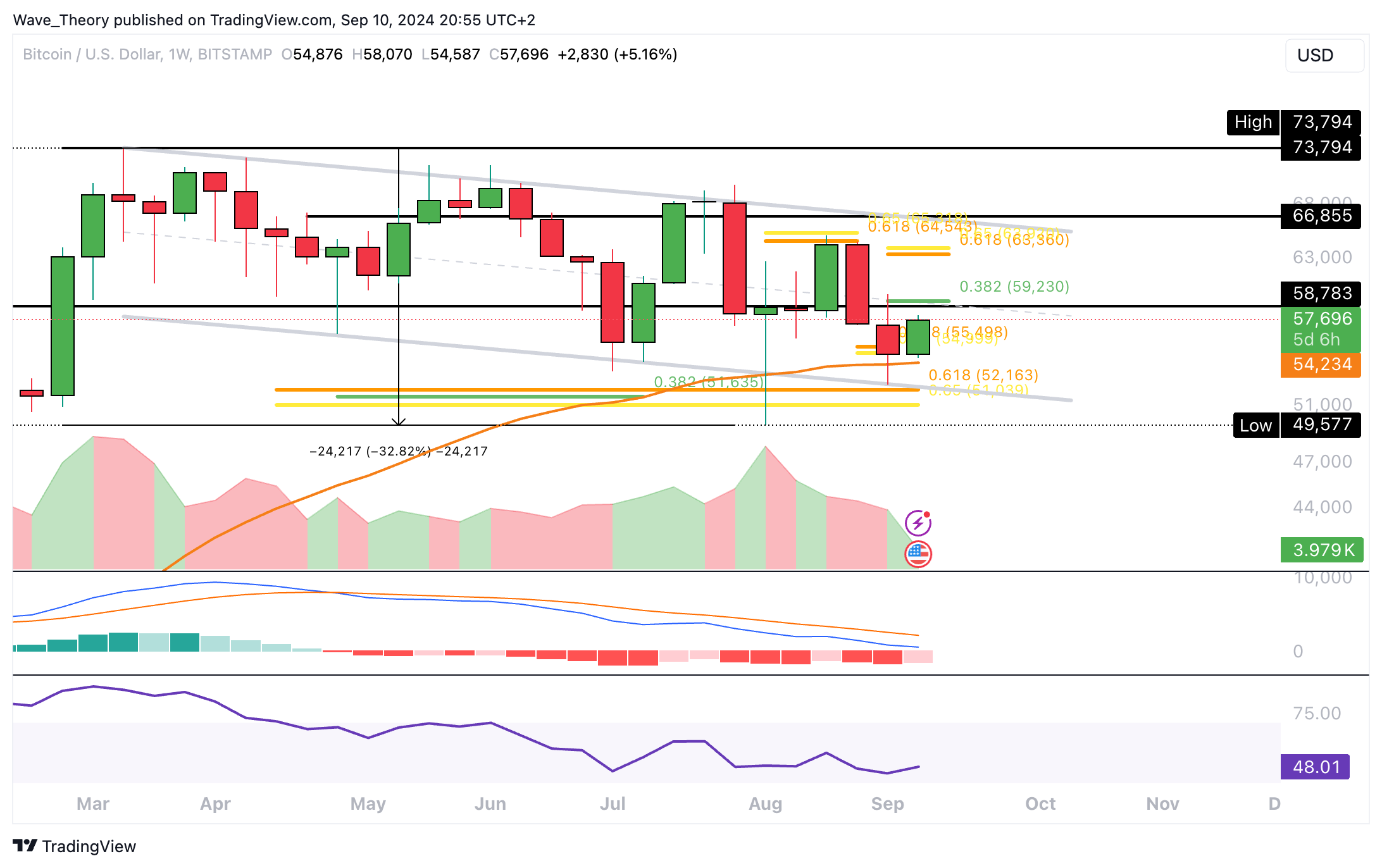 Bullische Hoffnung besteht aber noch, denn bisher konnte sich Bitcoin über der Golden Ratio Unterstützung bei rund 52.150 USD halten. Zudem konnte Bitcoin letzte Woche über dem 50-Wochen-EMA bei rund 54.230 USD schließen, was ebenfalls ein bullisches Zeichen ist.