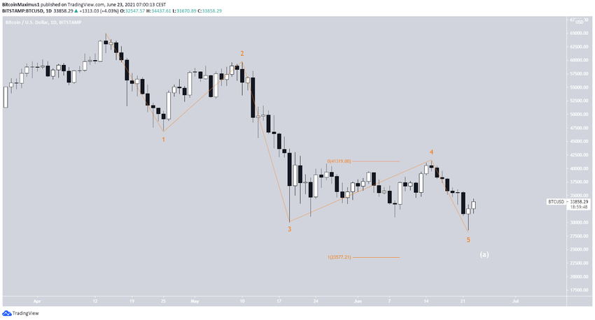 Der BTC Kurs hat wohl gerade die fünfte letzte eines bärischen Langzeit-Impulses abgeschlossen oder befindet sich in ihr. Der BTC Kurs hätte dann die A-Welle abgeschlossen. Auch wenn diese Wellenzählung gültig ist, so ist die fünfte Welle relativ kurz. Hätte sie die Länge der ersten Welle, dann wäre der BTC Kurs auf 23.577 USD gefallen. Allerdings ist diese Wellenzählung theoretisch nach wie vor valide.