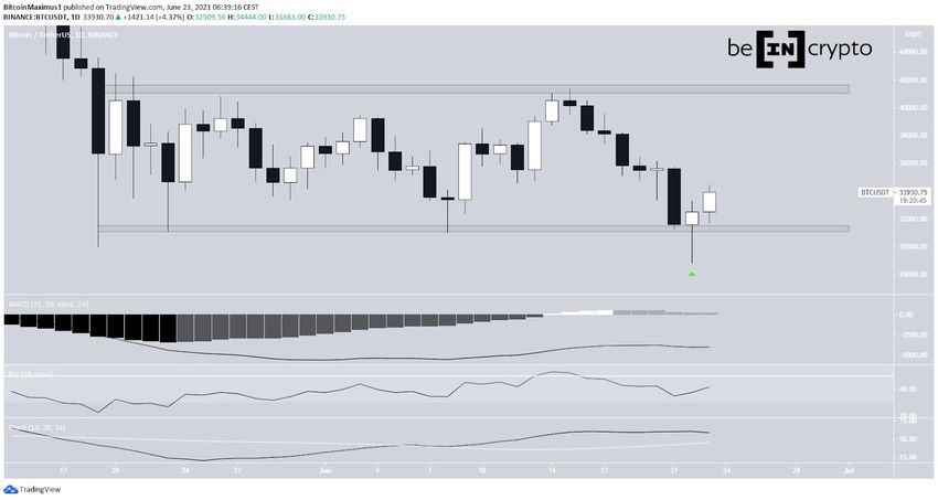 Gestern ist der Bitcoin Kurs unter das unten eingezeichnete Support-Level gefallen. Der Bitcoin Preis erreichte gestern ein Tagestief bei 28.805 USD. Allerdings stieg der BTC Kurs danach fast sofort wieder an. Deswegen hat die entsprechende Tageskerze die Form einer bullischen Hammer-Candlestick (über dem grünen Pfeil). Außerdem validierte der Bitcoin Kurs den Supportbereich bei 31.300 USD als Support.