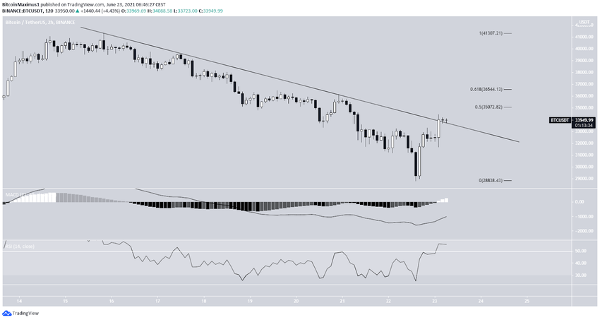 Auf dem 2-Stunden-Chart siehst du, dass der Bitcoin Kurs gerade dabei ist, über eine absteigende Widerstandslinie auszubrechen, die seit dem Hochpunkt bei 41.330 USD vom 15. Juni 2021 intakt ist. Die nächsten Widerstandslevel liegen bei 35.070 USD und 36.540 USD (das 0.5- und das 0.618-Fib-Retracement-Level). Sowohl der MACD als auch der RSI liefern uns bullische Signale. Das spricht dafür, dass sich die Aufwärtsbewegung fortsetzen wird.