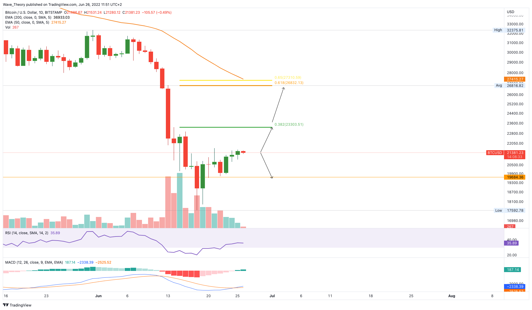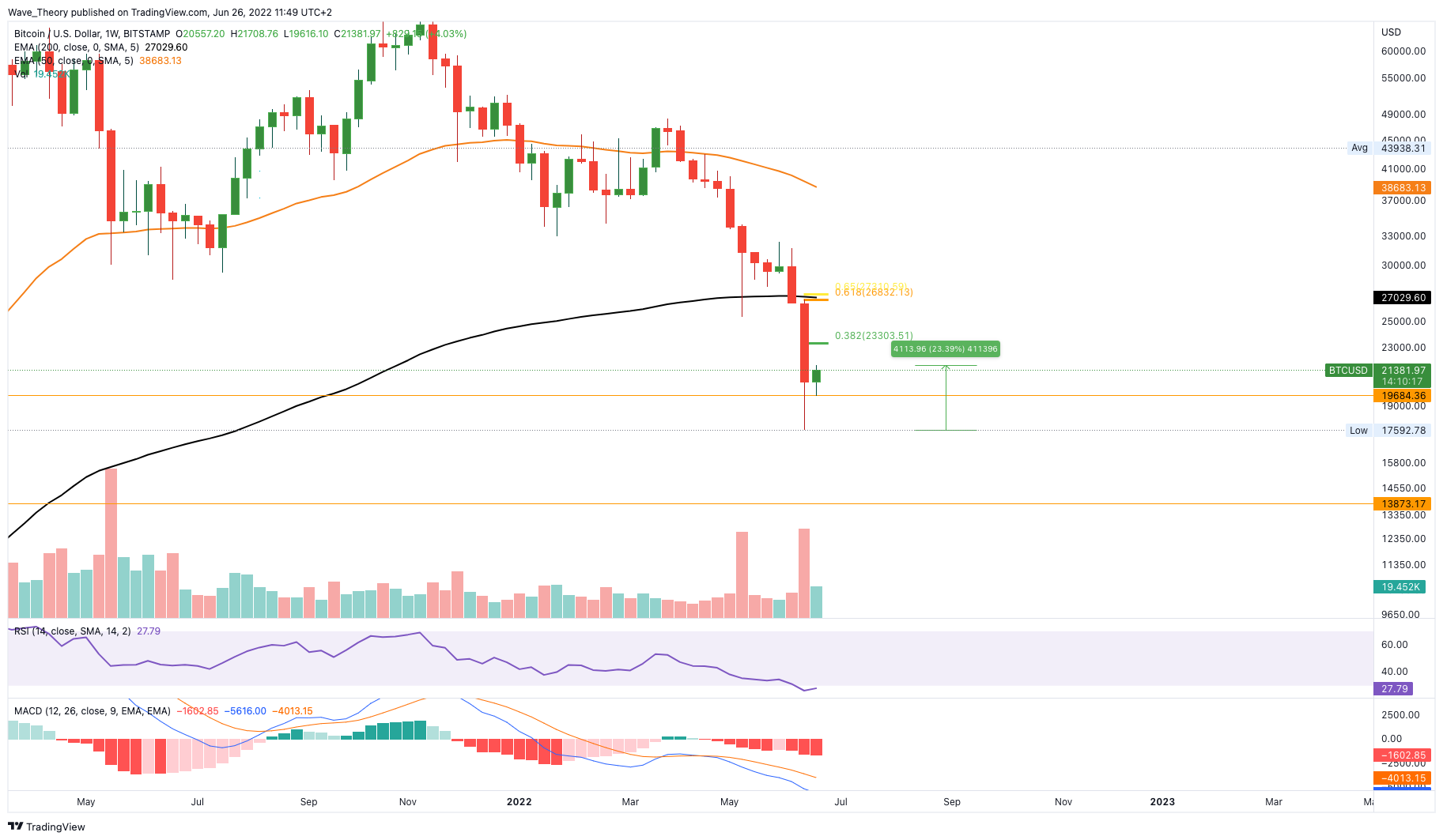 Nachdem der Bitcoin Kurs tiefer in die Unterstützungszone zwischen 14.000 – 20.000 USD eingedrungen war und rund 17.600 USD erreichte, konnte BTC bereits über 23 % nach oben abprallen. Damit befindet sich der Bitcoin Kurs jedoch noch immer rund 7 % unter dem ersten Fib Widerstand bei rund 23.300 USD.
