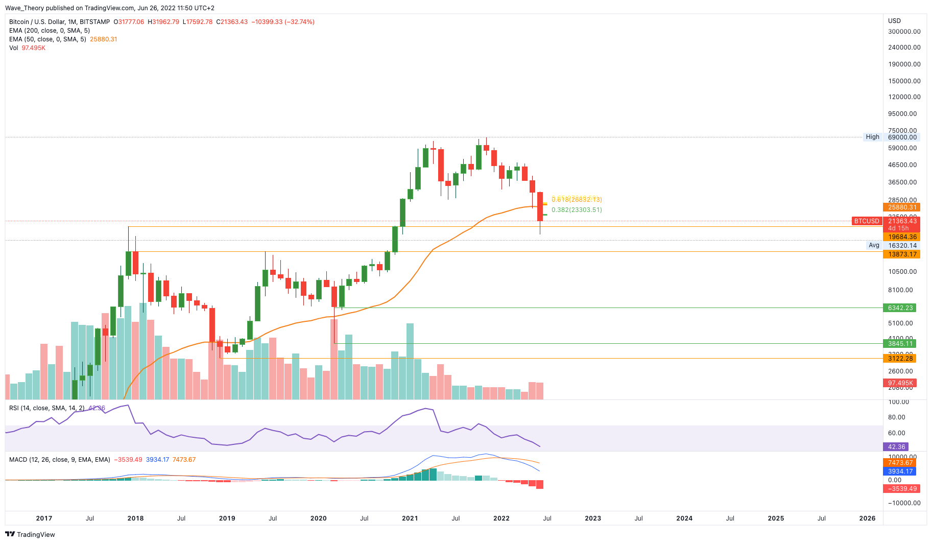 Grundsätzlich findet Bitcoin erst wieder signifikante Unterstützung zwischen 3.800 – 6.400 USD, sofern Bitcoin die Unterstützung zwischen 14.000 – 20.000 USD bärisch bricht.
