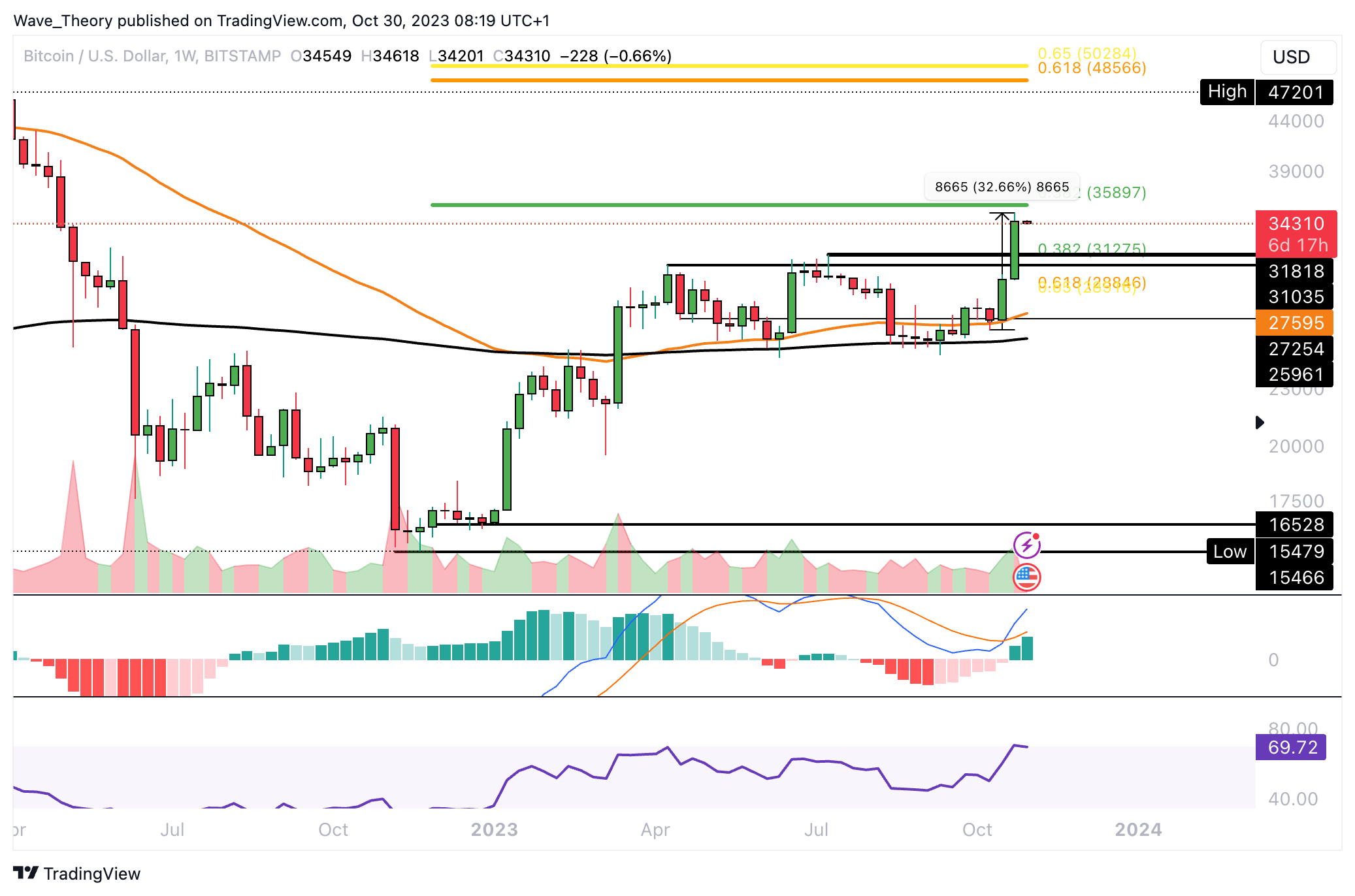 Zudem sind die MACD Linien bullisch überkreuzt. Tatsächlich sieht es gerade sehr bullisch für den BTC Kurs aus.