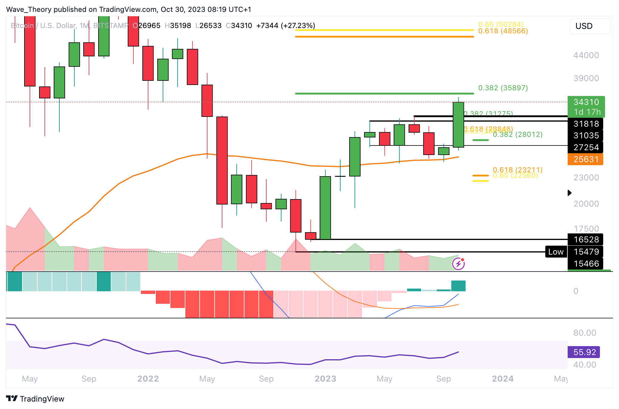 Die MACD Linien sind dabei ohnehin noch bullisch überkreuzt und der RSI bewegt sich weiterhin nach oben. Nach unten hin fungiert jetzt der 50-Monate-EMA bereits bei rund 52,3 % als signifikante Untersützung.