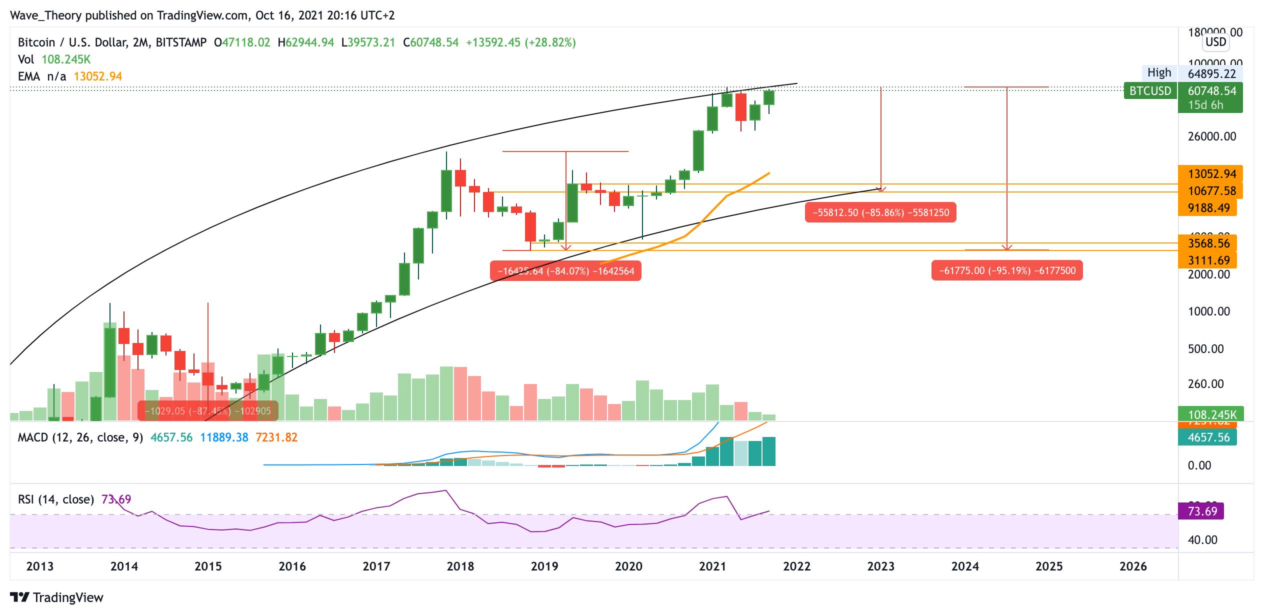 Aber ist ein Kurssturz auf 3.000 USD überhaupt möglich? Bevor Bitcoin auf 3.000 USD fällt, warten noch einige Unterstützungen auf ihn. Insbesondere bei rund 20.000 USD wartet historische Unterstützung auf den Bitcoin Kurs, welche durch den 50-Monate-EMA zusätzlich unterstützt wird. Jedoch könnte es auch im Monatskurs zu einer bärischen Divergenz im RSI und MACD kommen, wodurch ein Preissturz wahrscheinlicher werden würde. Dass Bitcoin aber auf 3.000 USD fällt, impliziert ein Kurssturz von 95 %.