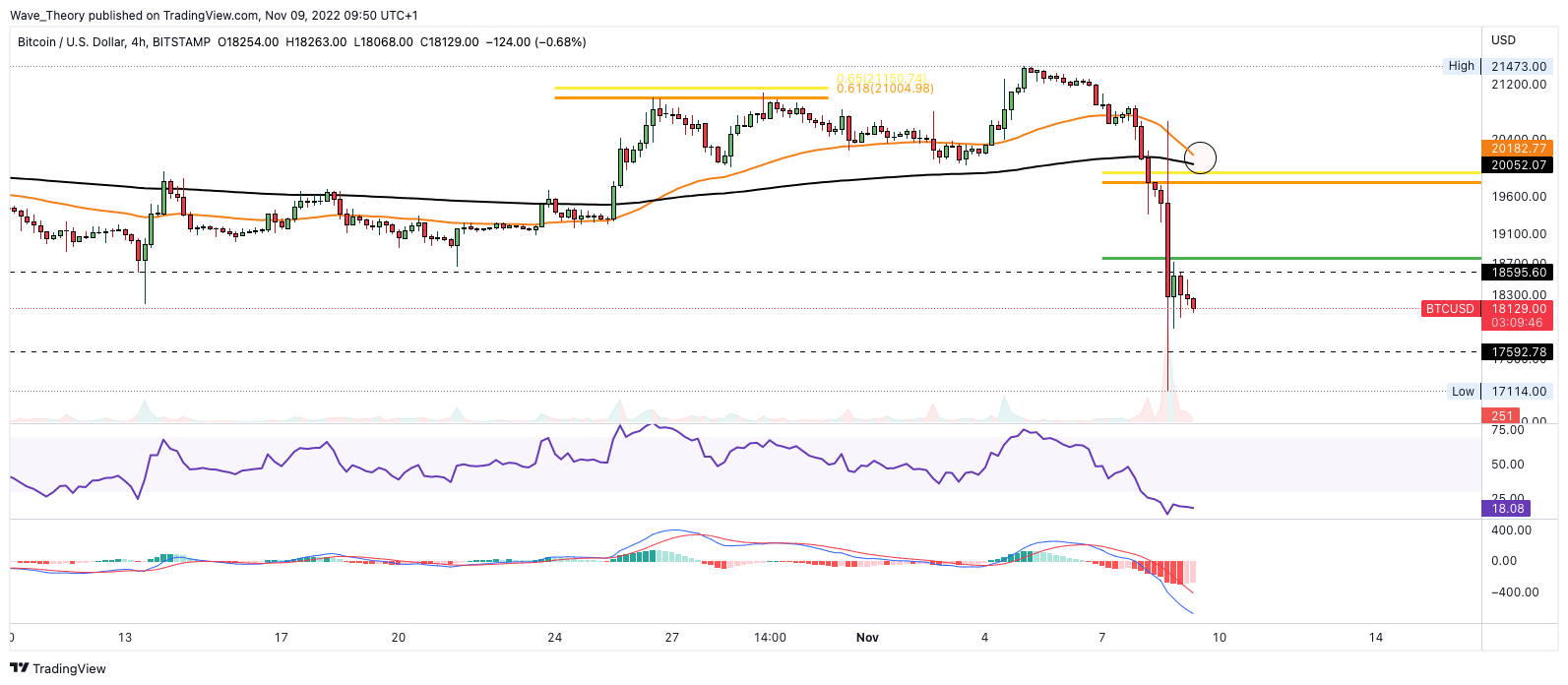 Tatsächlich könnte Bitcoin auf rund 14.000 USD fallen, sofern BTC jetzt nicht abprallt. Dabei stößt BTC bereits bei rund 18.775 USD und 20.000 USD auf signifikante Fib Widerstände und sofern diese nicht gebrochen sind, bleibt die Abwärtsbewegung intakt.