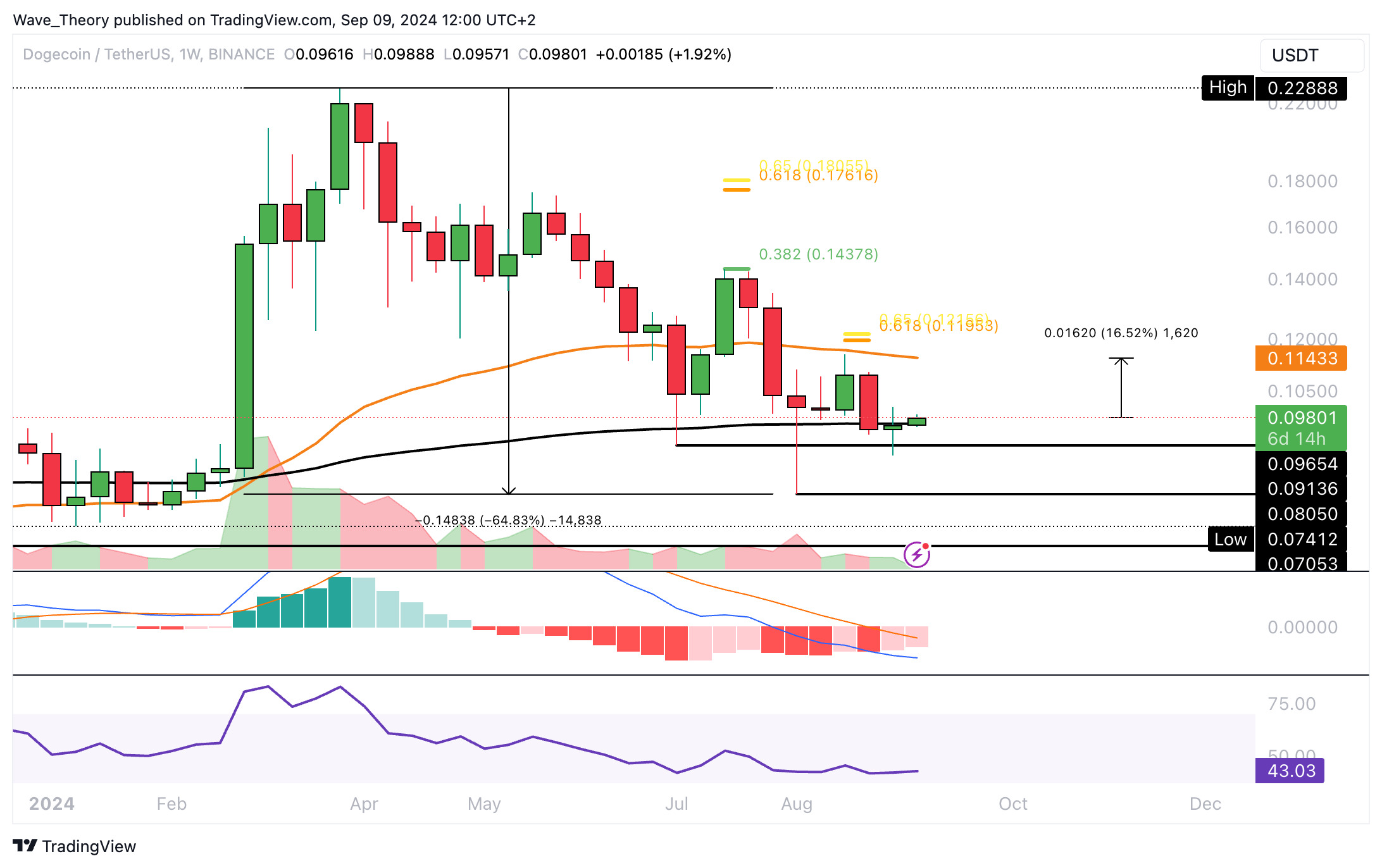 Aktuell scheint der DOGE Kurs an am 200-Wochen-EMA bei rund 0,0965 USD Unterstützung zu finden. Kann sich der DOGE Kurs darüber halten, könnte er den 50-Wochen-EMA bei rund 0,114 USD anvisieren.