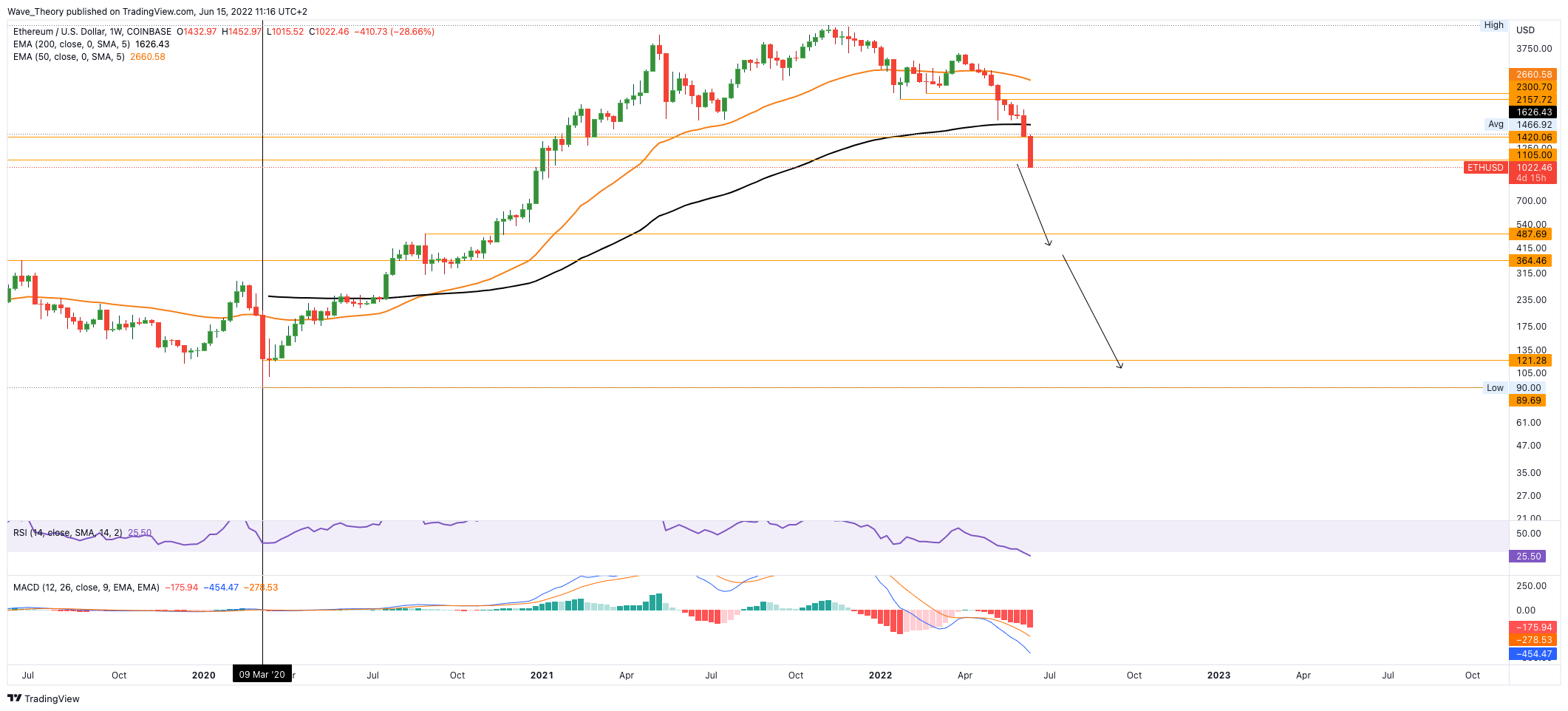 Sollte Ethereum also nicht spätestens zwischen 365 – 490 USD einen Boden finden, könnte er tatsächlich auf den Tiefpunkt im März 2020 zurückkehren.