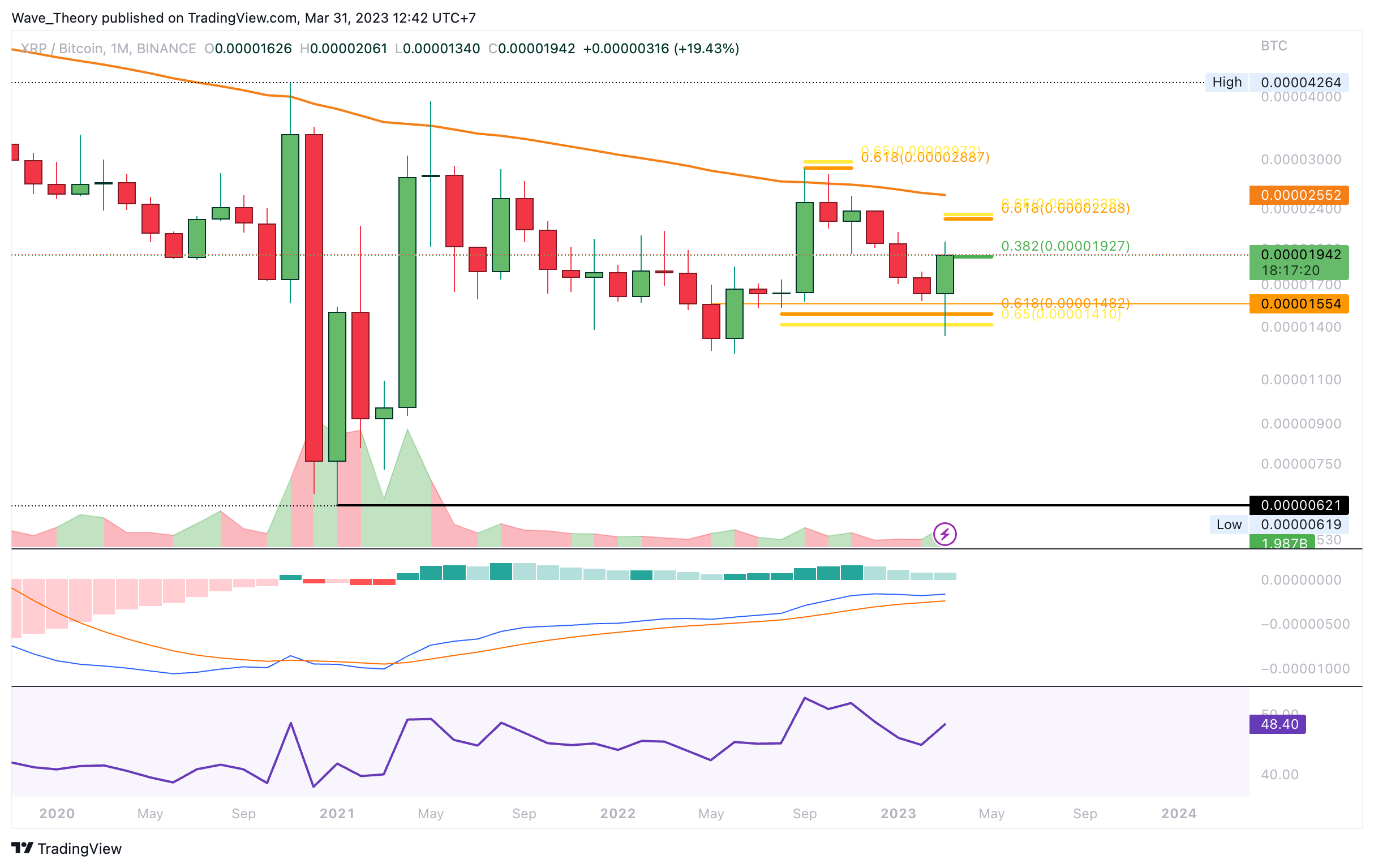 Davon abgesehen tickt das Histogramm des MACDs aber seit einigen Monaten bärisch tiefer und auch die MACD Linien könnten sich bald bärisch überkreuzen. Wirklich bullisch ist Ripple gegen BTC erst, wenn XRP den Golden Ratio Widerstand über dem 50-Monate-EMA bricht, welcher bei rund 0,000029 BTC liegt.