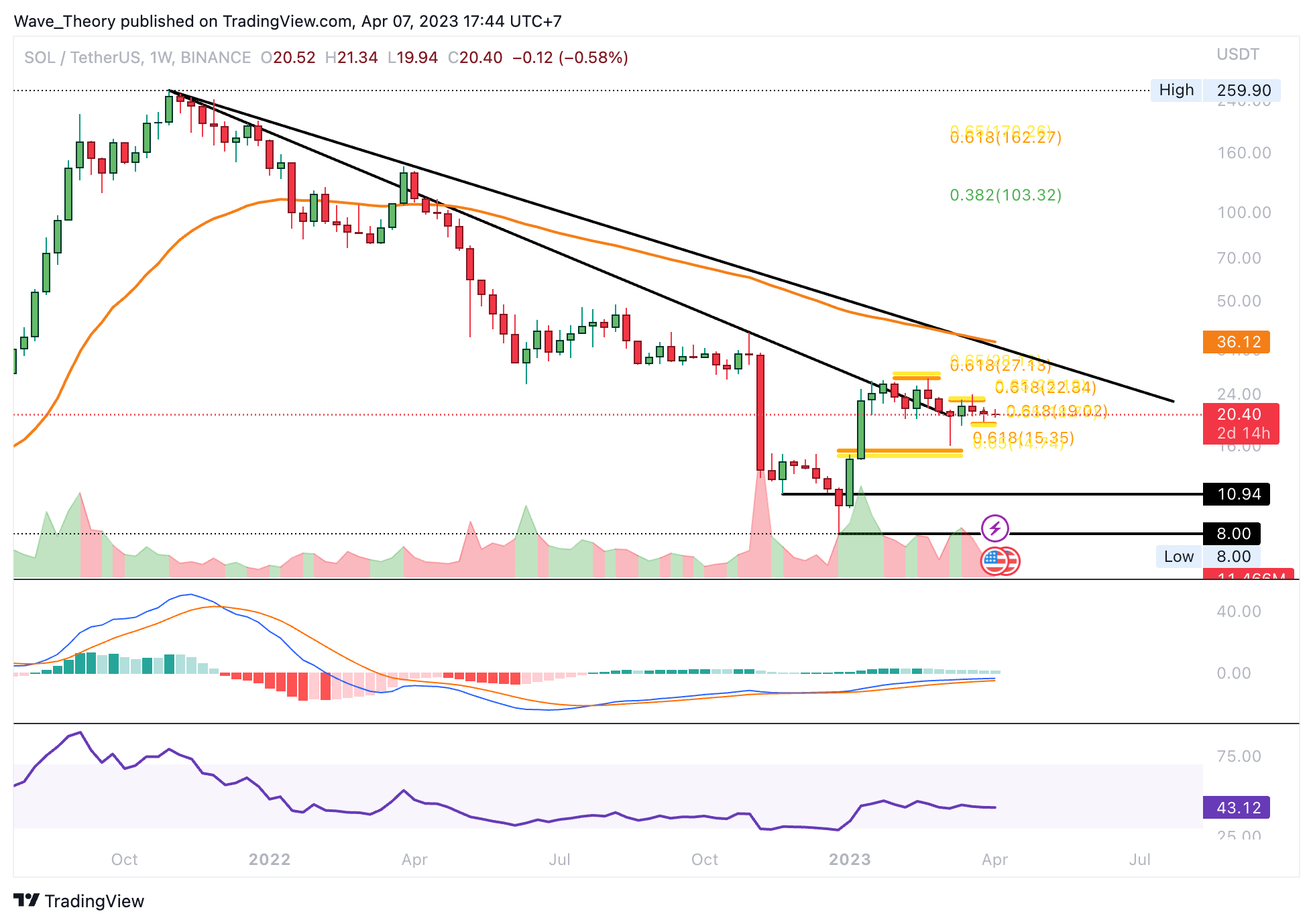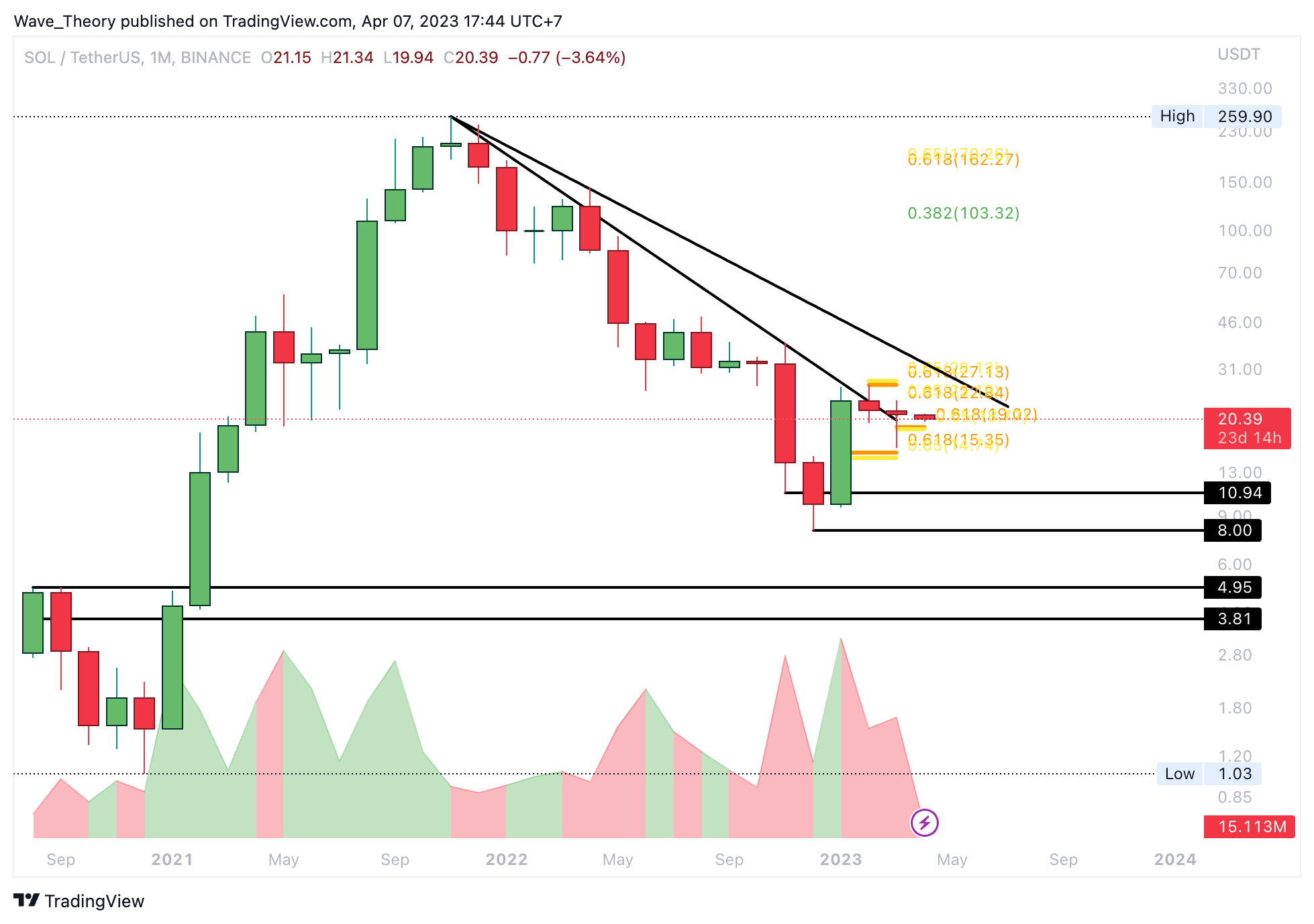 - Anschließend korrigierte der SOL Kurs stark, erreichte aber nicht die Golden Ratio Unterstützung bei rund 19 USD.