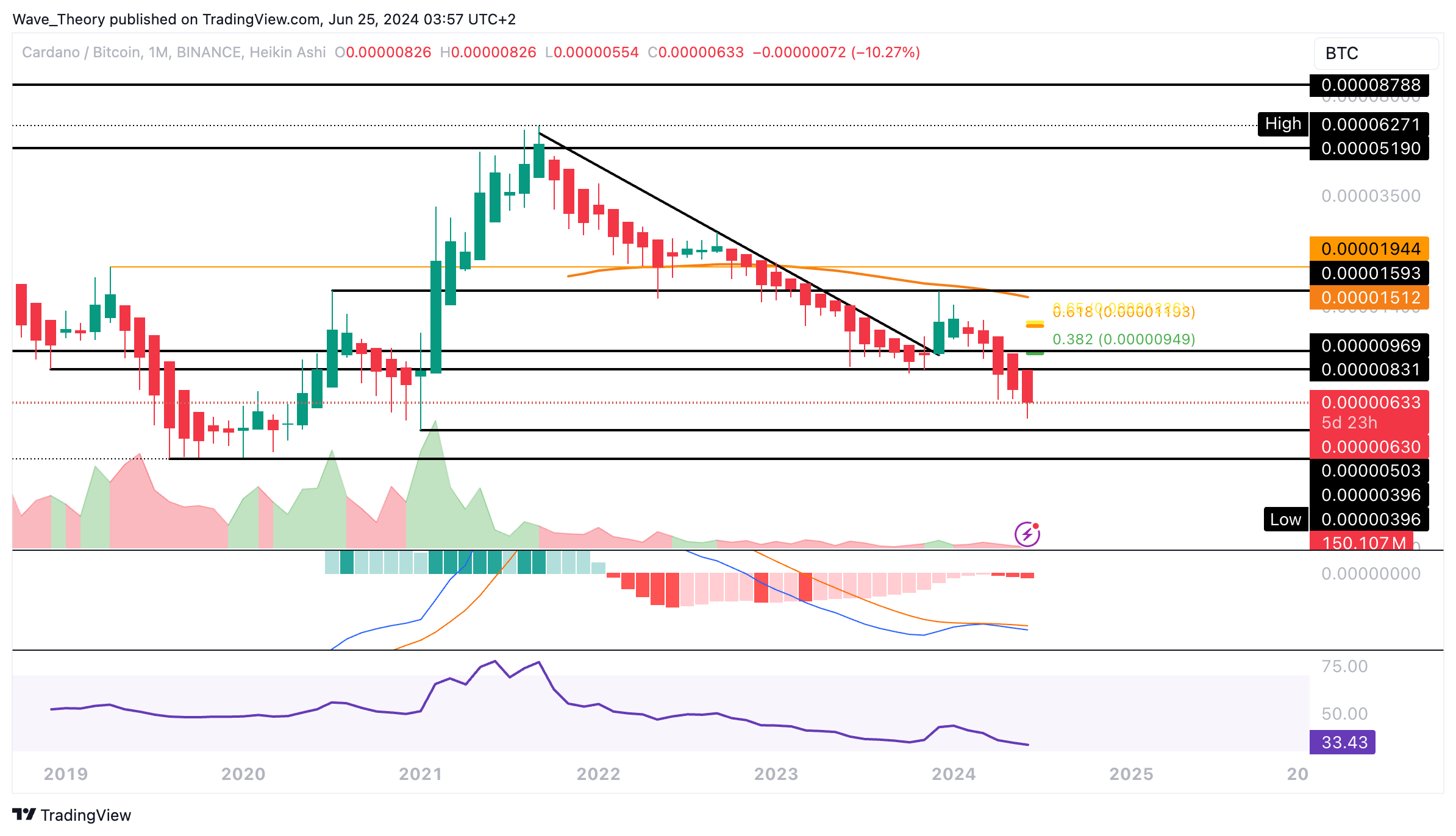 Gegen BTC befindet sich der ADA Kurs in einem klaren Abwärtstrend. Denn in den letzten sieben Monaten ist der ADA Kurs um mehr als 65 % gefallen.