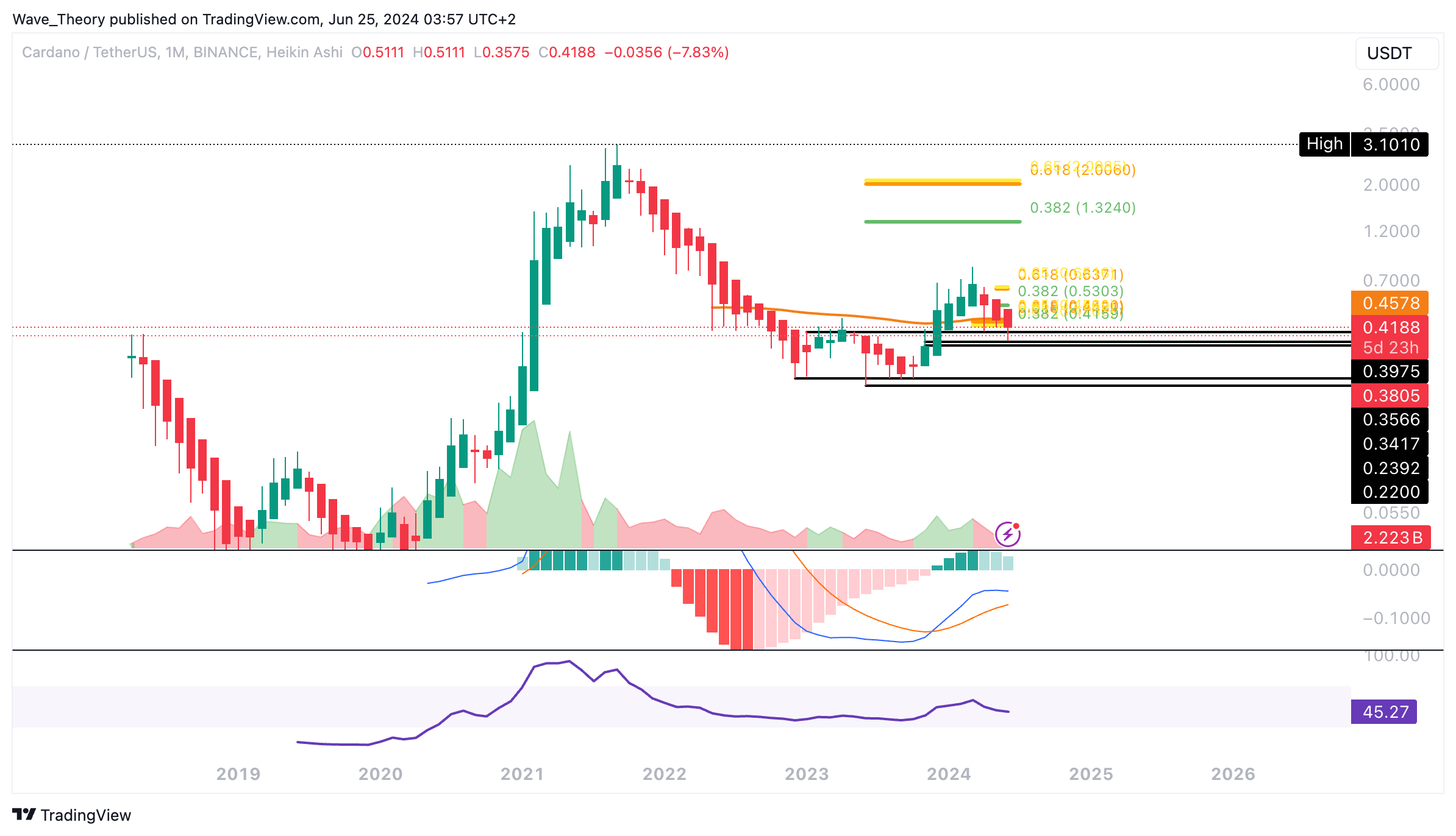 Mit dem Bruch der Golden Ratio Unterstützung bei rund 0,44 USD befände sich Cardano zurück im Abwärtstrend. Jedoch besteht noch die Chance, dass Cardano in diesem Monat darüber schließt.