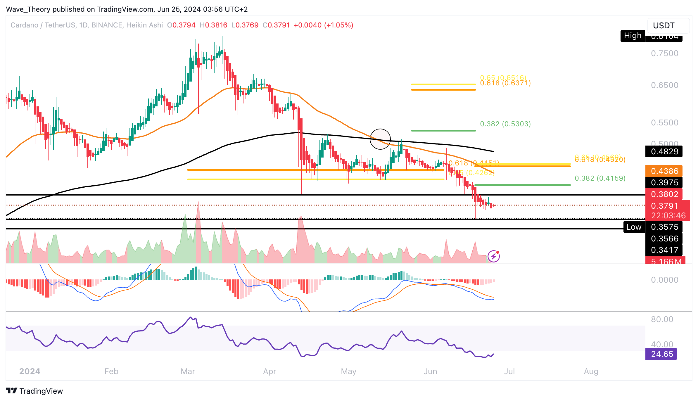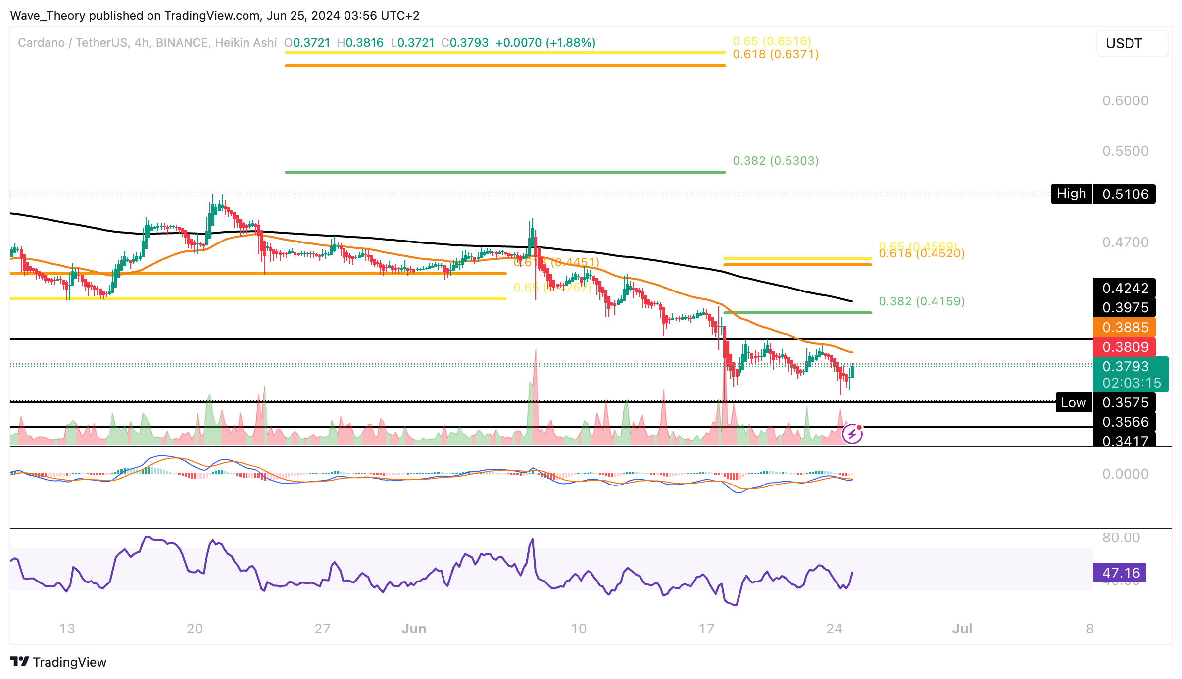 Der Cardano Kurs hatte zuvor die Golden Ratio Unterstützung bei rund 0,44 USD bärisch gebrochen. Anschließend erreichte Cardano die horizontale Unterstützungszone zwischen rund 0,342 USD und 0,3566 USD.