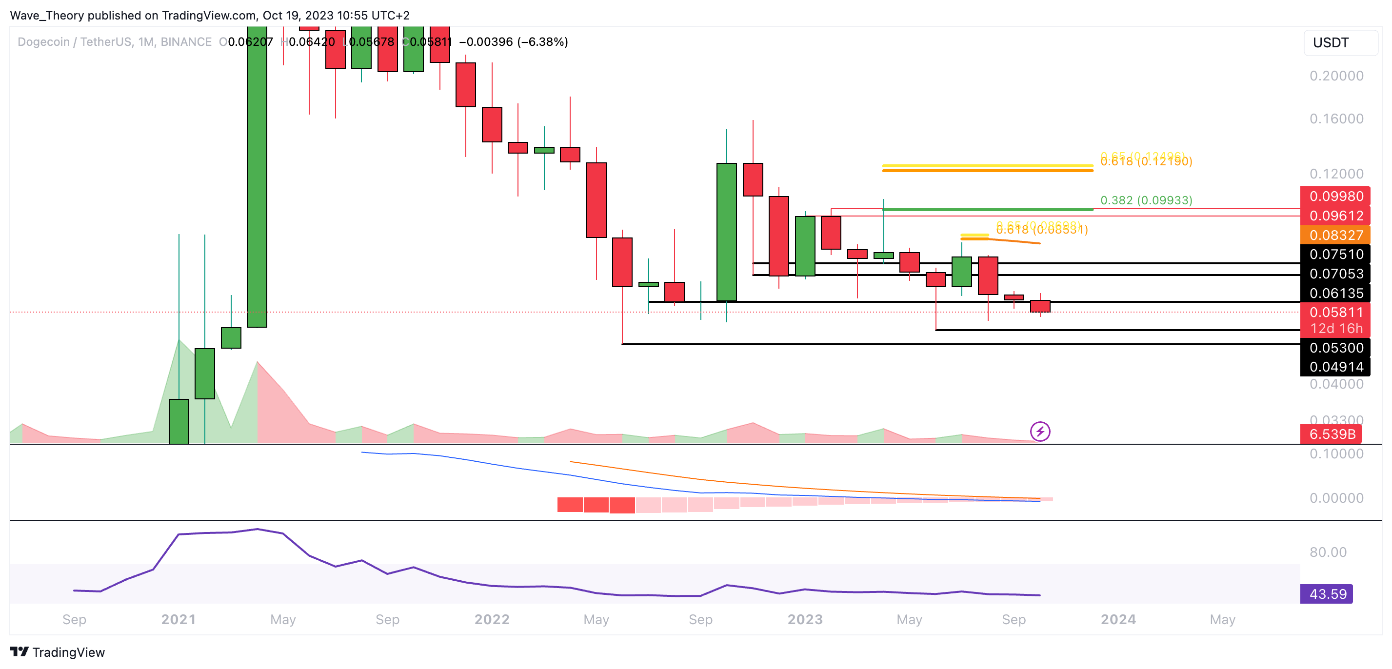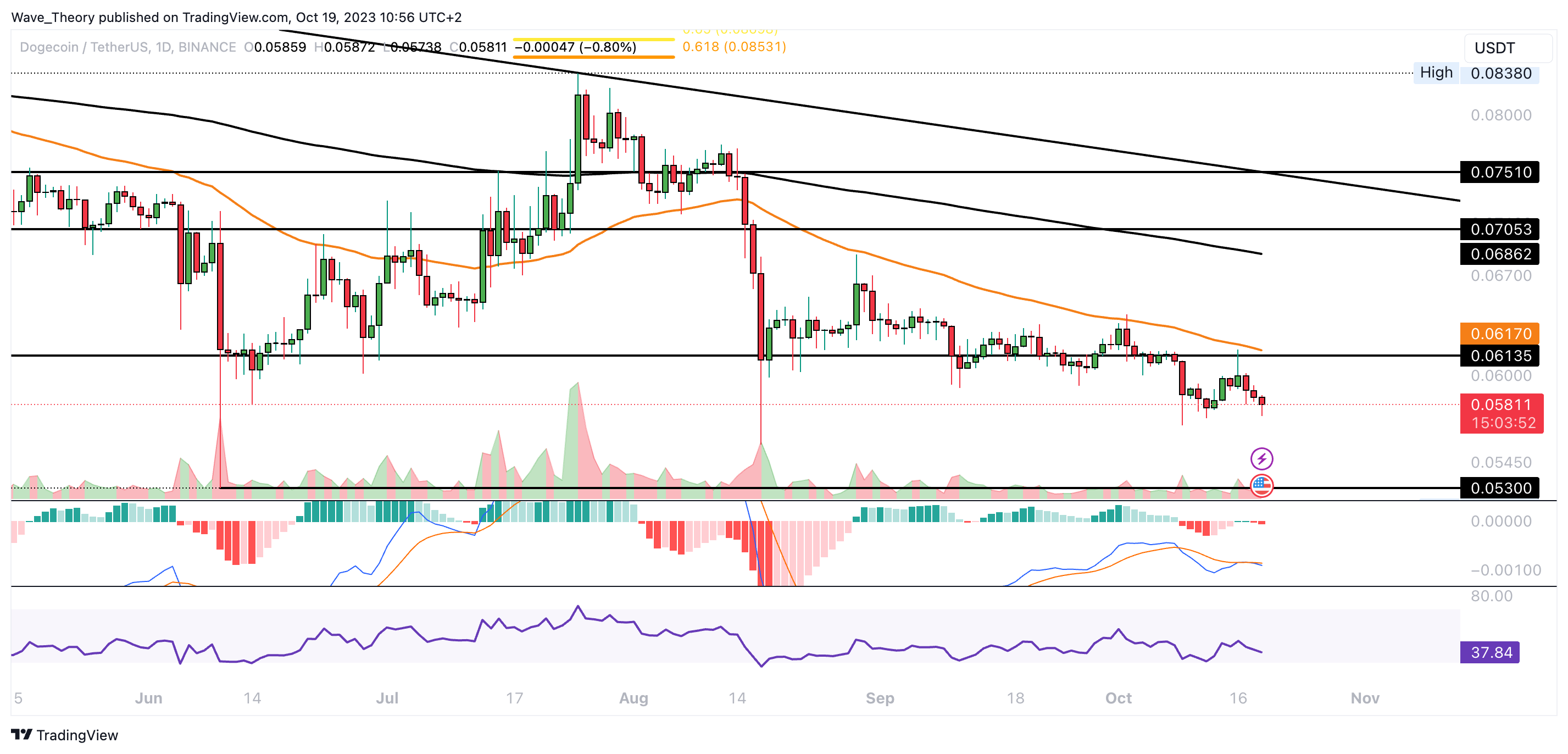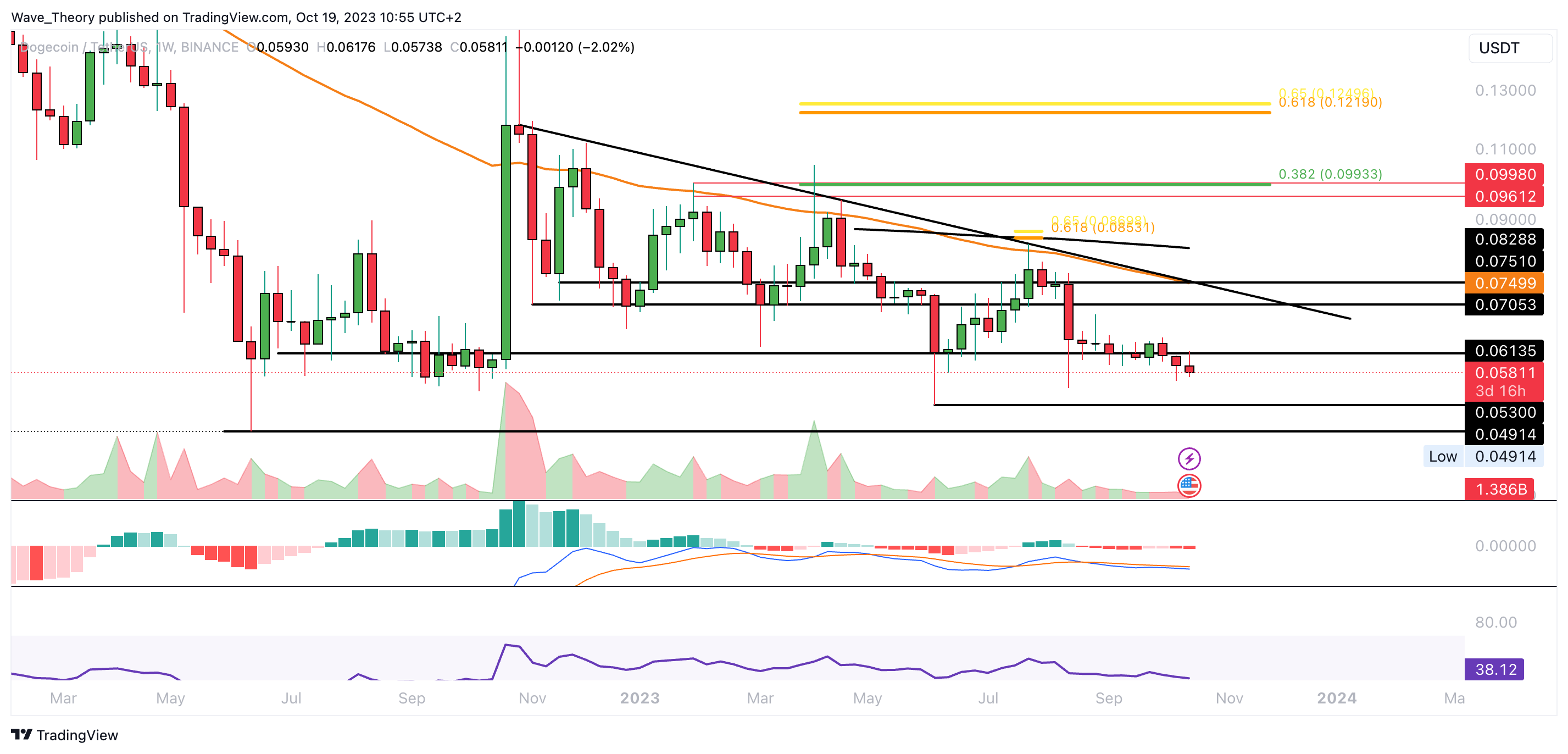 Der Dogecoin Kurs hat die Unterstützung bei rund 0,06135 USD bärisch gebrochen. Damit könnte der DOGE Kurs jetzt zur nächsten Unterstützung zwischen rund 0,049 USD und 0,053 USD zurückkehren.