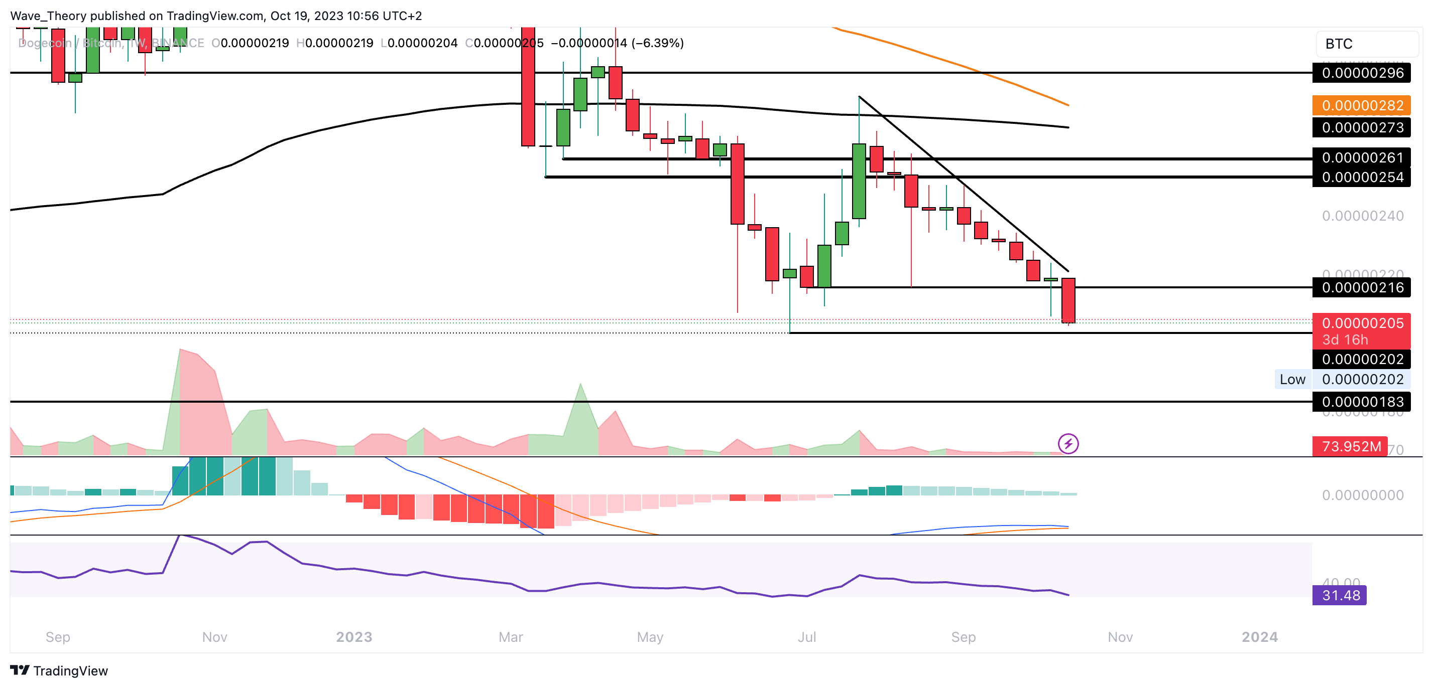 Der RSI erreicht inzwischen überverkaufte Regionen. An der Unterstützung bei rund 0,000002 BTC könnte der DOGE Kurs bullisch abprallen.