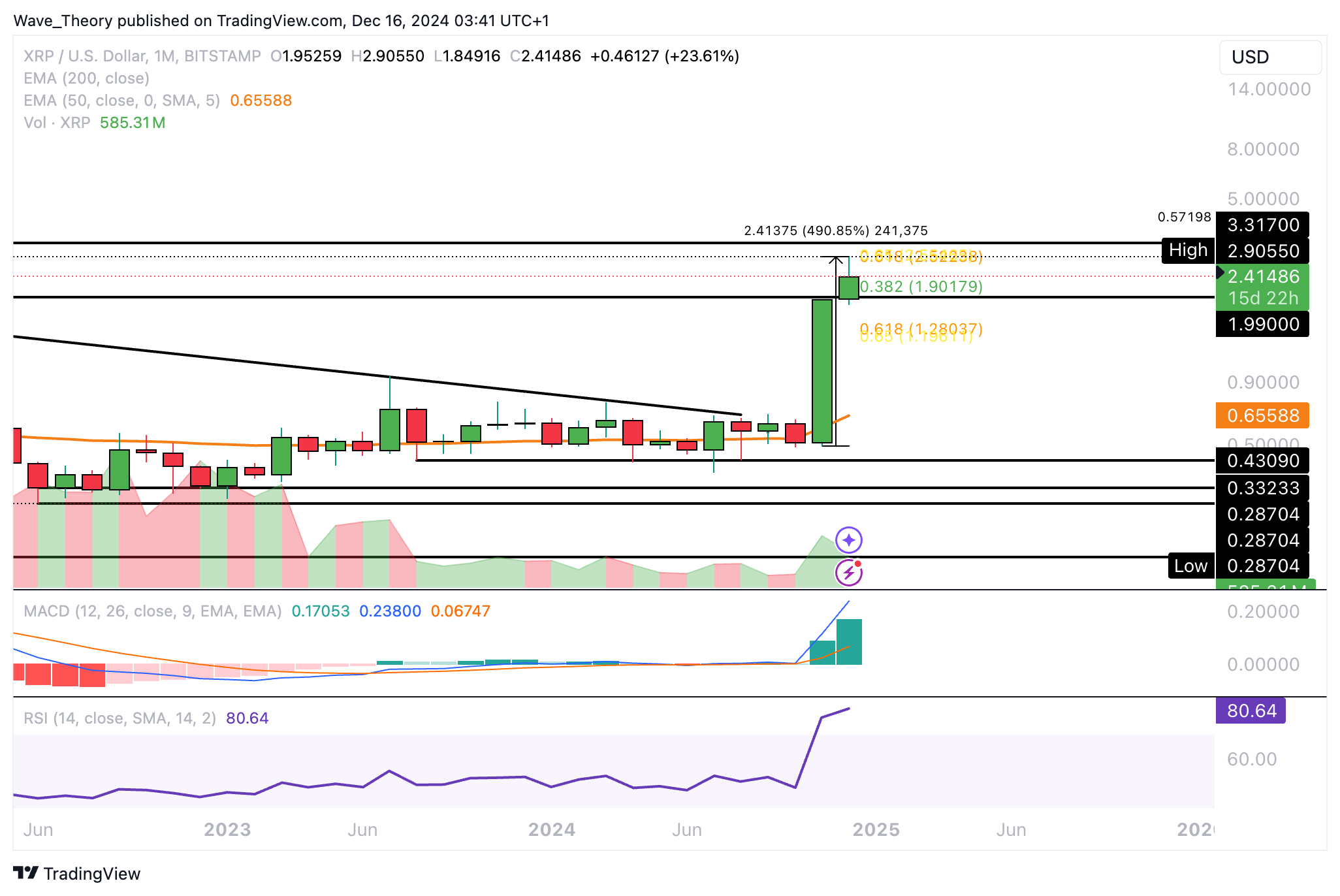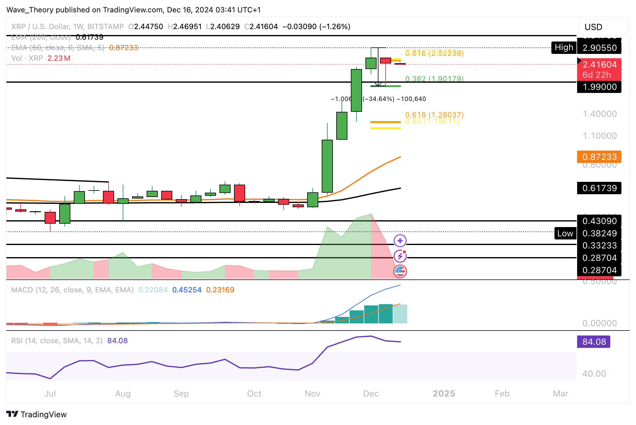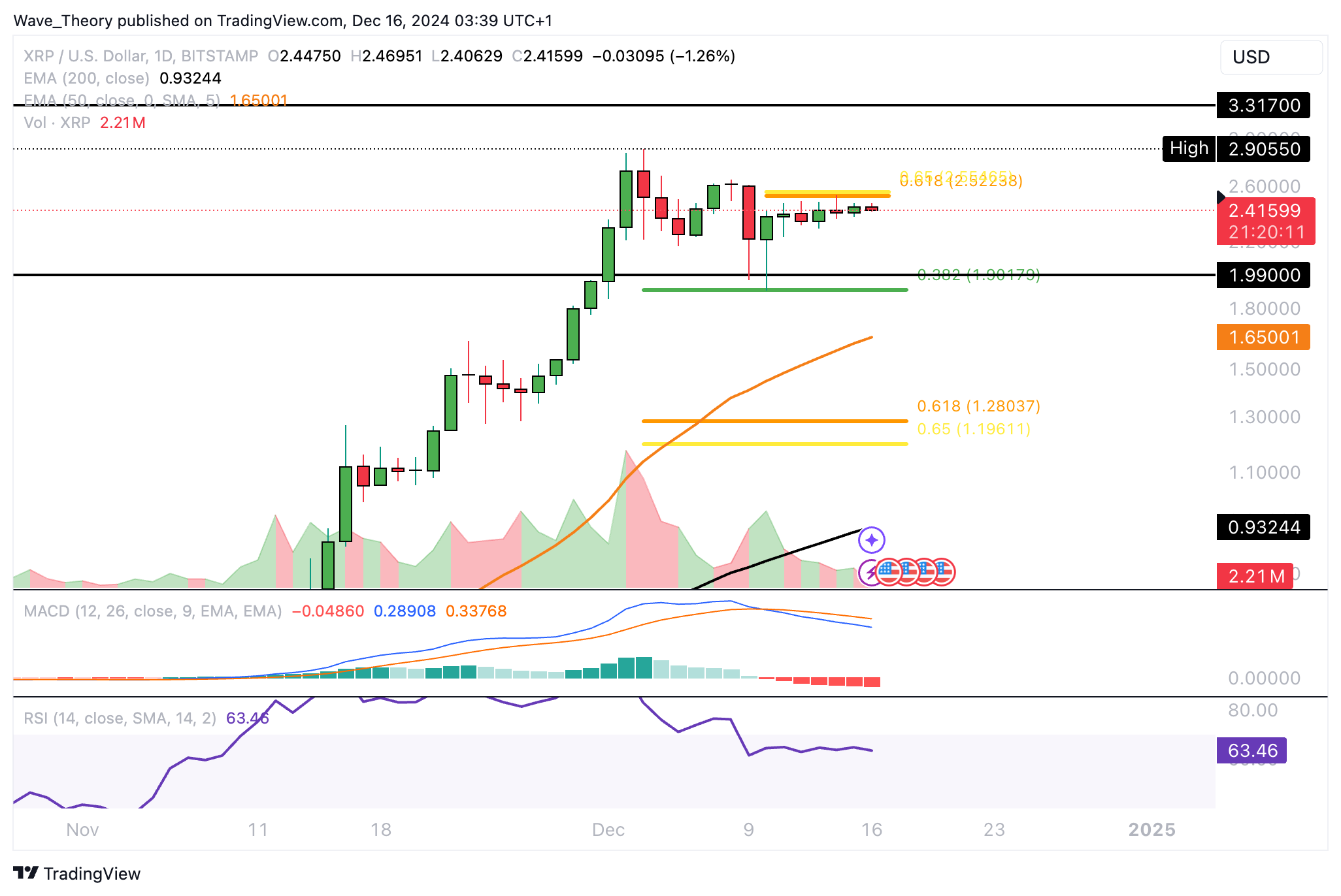 Mit dem Anstieg von rund 33,3 % hat Ripple den Golden Ratio Widerstand bei rund 2,52 USD erreicht, woran Ripple vor zwei Tagen zunächst bärisch abgewiesen wurde.