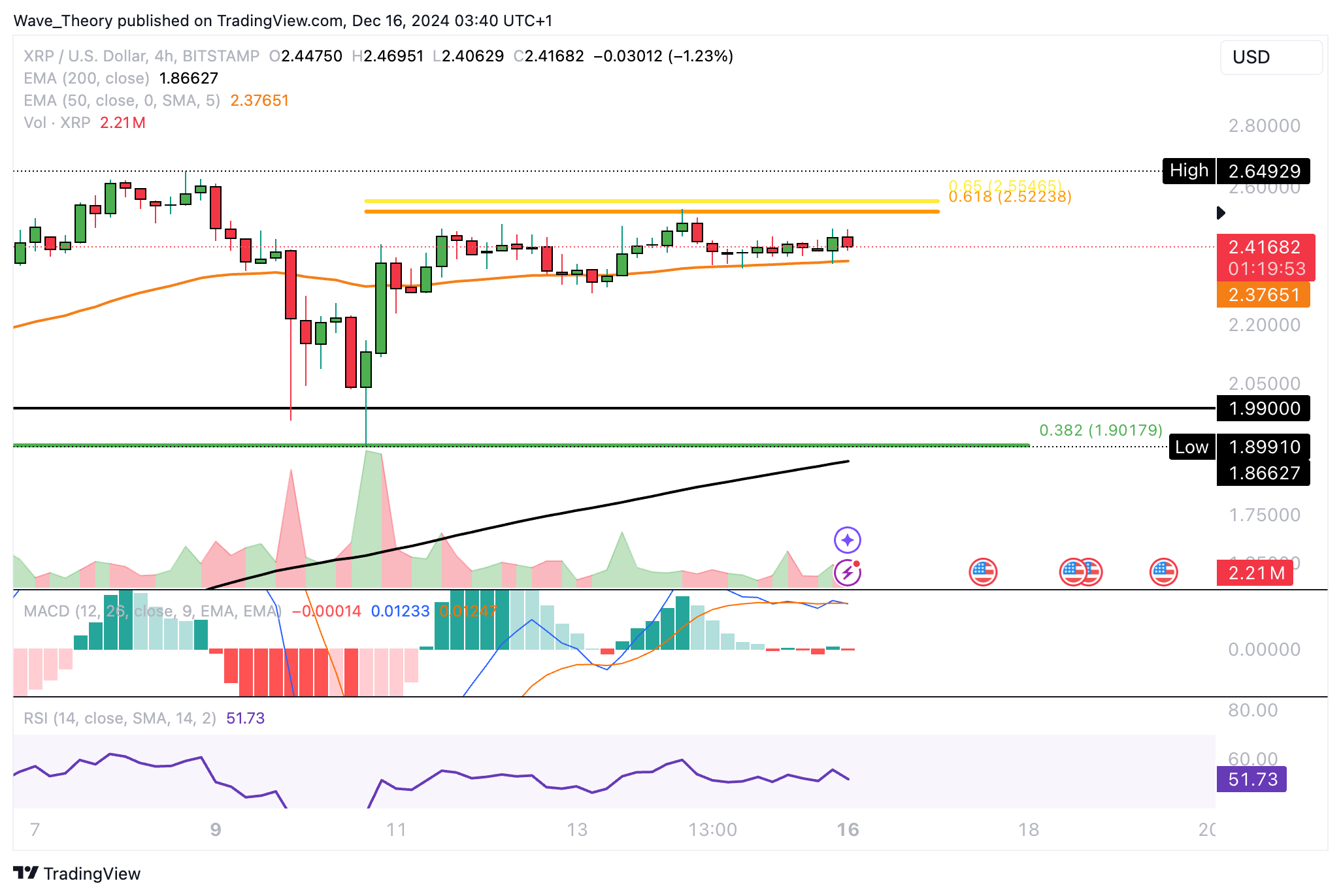 Ripple findet jetzt zusätzliche Unterstützung am 50-4H-EMA, welcher bei rund 2,376 USD liegt. Wenn sich Ripple darüber hält, liegt ein bullischer Bruch der Golden Ratio bei rund 2,52 USD nahe.
