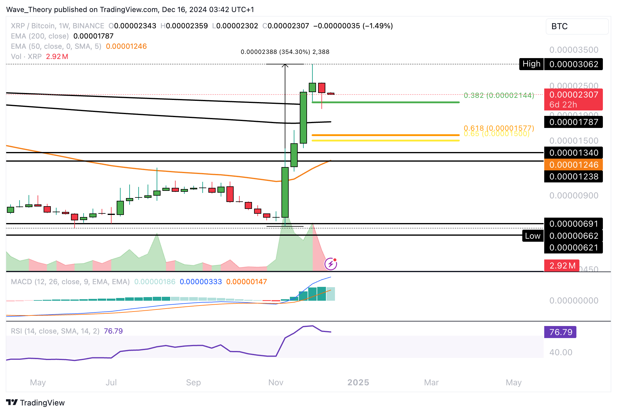 Wenn Ripple diese bricht, wartet bei rund 0,0000155 BTC die nächste signifikante Fib Unterstützung. Insgesamt zeichnen die Indikatoren im Wochenchart dabei ein gemischtes Bild ab.