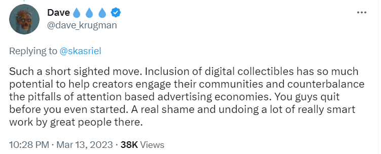 Andere User, wie der NFT-Künstler Dave Krugman entgegnen Metas Statement deutliche Kritik. Aus seiner Sicht stampft der Social-Media-Riese das Projekt ein, bevor es überhaupt angefangen hat. Denn in der Einbeziehung digitaler Sammlerstücke sieht der Künstler großes Potenzial, seine Community zu erreichen und der aufmerksamkeitsbasierten Werbeökonomie etwas entgegenzusetzen. Die Entscheidung gegen NFT sieht Krugman als Schande, die das Vertrauen der Szene verspielt und die Künstler noch weiter weg drängt.