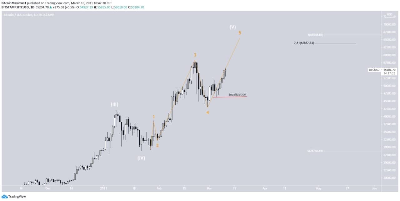 Der Hochpunkt der letzten Welle liegt wahrscheinlich zwischen 63.882 USD und 66.548 USD. Das Invalidierungslevel liegt nun bei 46.294 USD (die rote Linie). Sollte der Bitcoin Preis unter das Level fallen, dann wird er wahrscheinlich einen neuen Tiefpunkt anpeilen.