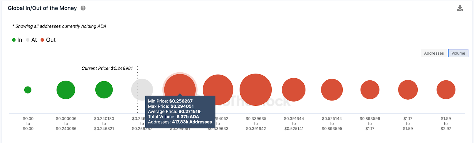 SponsoredDemnach ist der anfängliche Widerstand bei etwa 0,27 USD ziemlich bedeutend. Wie unten dargestellt, haben die 417.830 Wallets 6,4 Milliarden ADA zu einem Durchschnittspreis von 0,27 USD gekauft.