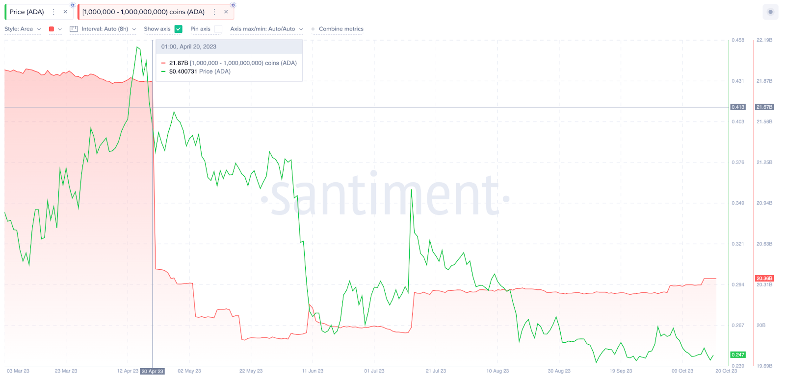 Zwischen dem 19. April und 20. Mai verkauften sie sagenhafte 1,98 Milliarden ADA im Wert von 831,6 Millionen USD. Dieser Verkauf wiederum führte laut Santiment zu einem Preissturz um ganze 24 %.
