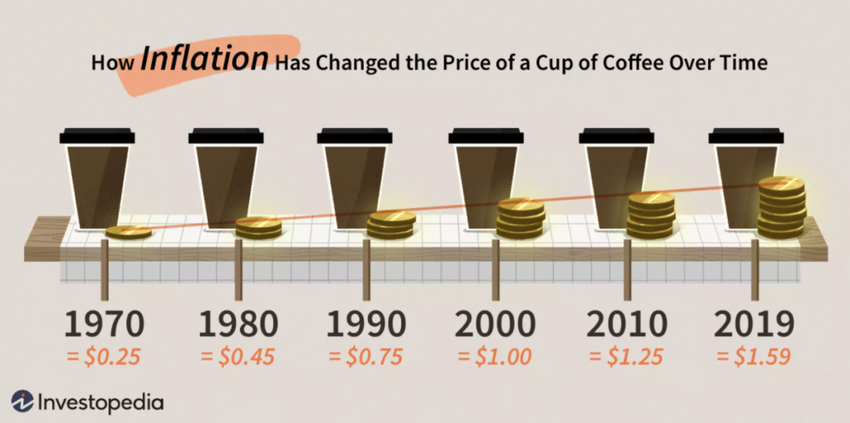Inflation ist der Rückgang der Kaufkraft einer bestimmten Währung im Laufe der Zeit. Eine quantitative Schätzung der Rate, mit der die Kaufkraft sinkt, kann sich in einem Anstieg des durchschnittlichen Preisniveaus eines Warenkorbs (VPI) über einen bestimmten Zeitraum niederschlagen. Der Anstieg des allgemeinen Preisniveaus, oft in Prozent ausgedrückt, bedeutet, dass eine Währungseinheit tatsächlich weniger Kaufkraft als in früheren Perioden aufweist.